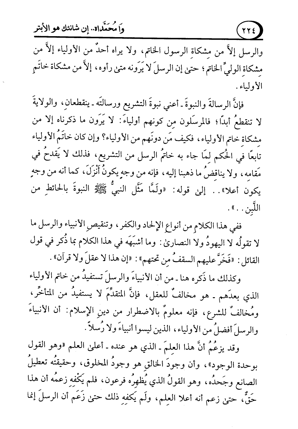 والرسل إلاَّ من مِشكاةِ الرسول الخاتم، ولا يراه أحدٌ من الأولياء إلاَّ من مِشكاةِ الوليِّ الخاتم؛ حتى إن الرسلَ لا يَرَونه متى رأوه، إلاَّ من مشكاة خاتَمِ الأولياء.