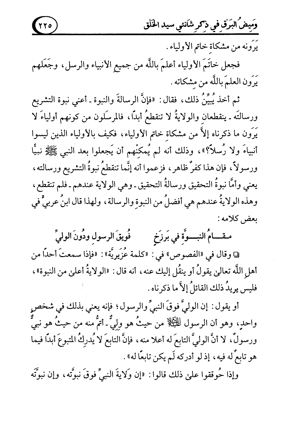 أو يقول: إن الوليَّ فوقَ النبيِّ والرسول؛ فإنه يعني بذلك في شخصٍ واحدٍ وهو أن الرسول - عليه السلام - من حيثُ هو وِلِيٌّ- أتمُّ منه من حيثُ هو نبيُّ ورسولٌ، لا أنَّ الوليَّ التابعَ له أعلى منه، فإنَّ التابعَ لا يُدرِك المتبوعَ أبدًا فيما هو تابع له فيه، إذ لو أدركه لَم يكن تابعًا له".