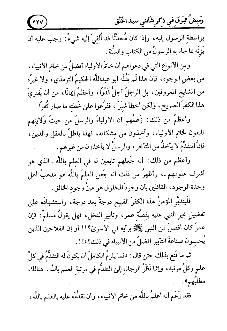 ومِن الأنواع التي في دعواهم أن خاتمَ الأولياء أفضلُ من خاتم الأنبياء، من بعضِ الوجوه، فإن هذا لَم يَقُلْه أبو عبد الله الحكيمُ الترمذي، ولا غيرُه من المشايخ المعروفين، بل الرجلُ أجل قَدْرًا، وأعظمُ إيمانًا، من أن يَفتريَ هذا الكفرَ الصريح، ولكن أخطأ شبْرًا، ففرَّعوا على خَطئِه ما صار كُفرًا.