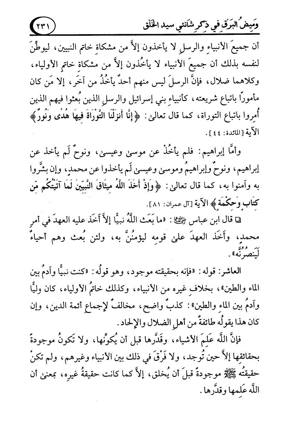 أن جميعَ الأنبياءِ والرسل لا يأخذون إلاَّ من مشكاةِ خاتم النبيين، ليوطِّنَ لنفسه بذلك أن جميعَ الأنبياء لا يأخُذون إلاَّ من مشكاةِ خاتمِ الأولياء، وكلاهما ضلال، فإنَّ الرسلَ ليس منهم أحدٌ يأخُذُ من آخَر، إلا مَن كان مأمورًا باتباع شريعته، كأنبياءِ بني إسرائيل والرسل الذين بُعثوا فيهم الذين أُمِروا باتباع التوراة، كما قال تعالى: {إِنَّا أَنْزَلْنَا التَّوْرَاةَ فِيهَا هُدًى وَنُورٌ} الآية [المائدة: 44].