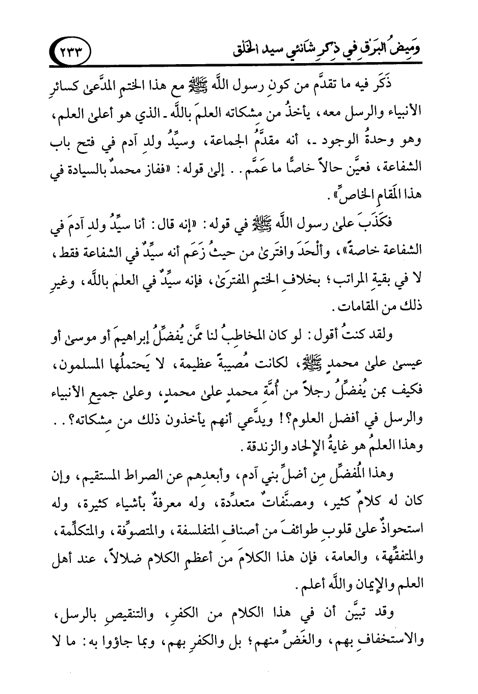 فكَذَبَ على رسول الله - صلى الله عليه وسلم - في قوله: "إنه قال: أنا سيِّدُ ولدِ آدمَ في الشفاعة خاصةً"، وألْحَدَ وافتَرى من حيثُ زَعَم أنه سيِّدٌ في الشفاعة فقط، لا في بقيةِ المراتب؛ بخلافِ الختمِ المفترَى، فإنه سيدٌ في العلم بالله، وغيرِ ذلك من المقامات.