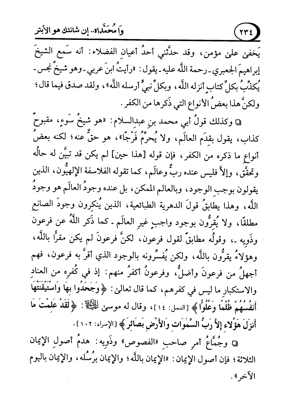 يَخفى على مؤمن، وقد حدَّثني أحدُ أعيانِ الفضلاء: أنه سَمع الشيخَ إبراهيمَ الجعبري -رحمة الله عليه- يقول: "رأيتُ ابنَ عربي -وهو شيخٌ نجس- يُكذِّبُ بكلِّ كتابٍ أنزله الله، وبكل نبيٍّ أرسله الله"، ولقد صدق فيما قال, ولكنَّ هذا بعضُ الأنواع التي ذَكرها من الكفر.