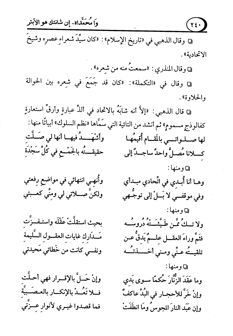 ° قال الذهبي: "إلاَّ أنه شابَهُ بالاتحاد في ألذِّ عبارة وأرقِّ استعارةٍ كفالوذجٍ مسمومٍ" ثم أنشد من التائية التي سَمَّاها "نظم السلوك" أبياتًا منها: