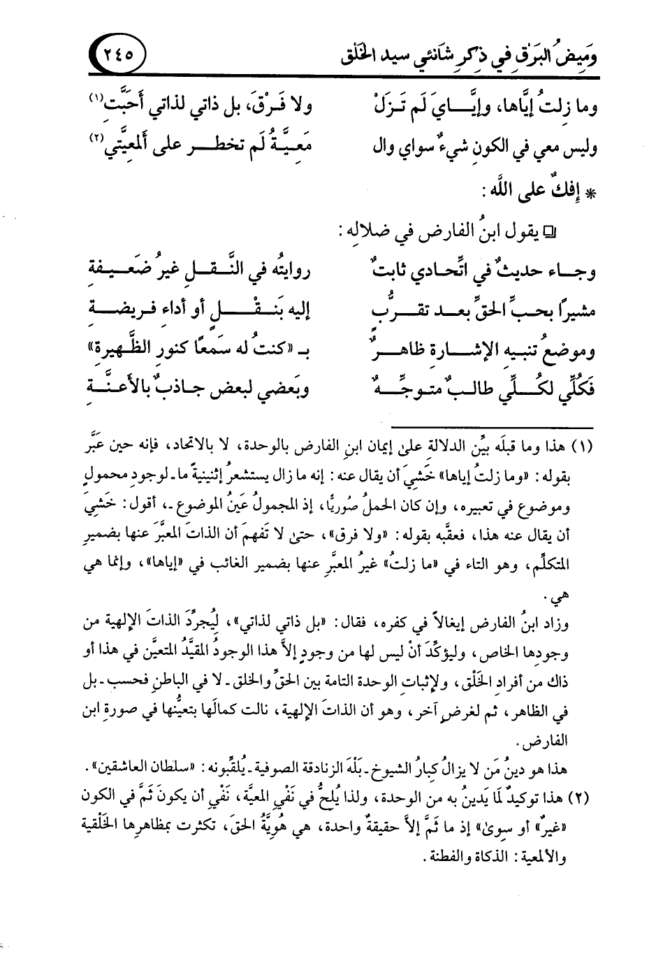(¬1) هذا وما قبلَه بين الدلالةِ على إيمان ابنِ الفارض بالوحدة، لا بالاتحاد، فإنه حين عَبر بقوله: "وما زلتُ إياها" خَشِيَ أن يقال عنه: إنه ما زال يستشعر إثنينيةً ما -لوجودِ محمولٍ وموضوع في تعبيره، وإن كان الحملُ صُوريًّا، إذ المجمولُ عَينُ الموضوع-، أقول: خَشِي أن يقال عنه هذا، فعقبه بقوله: "ولا فرق"، حتى لا تَفهمَ أن الذاتَ المعبرَ عنها بضميرِ المتكلم، وهو التاء في "ما زلتُ" غيرُ المعبرِ عنها بضمير الغائب في "إياها"، وإنما هي هي.