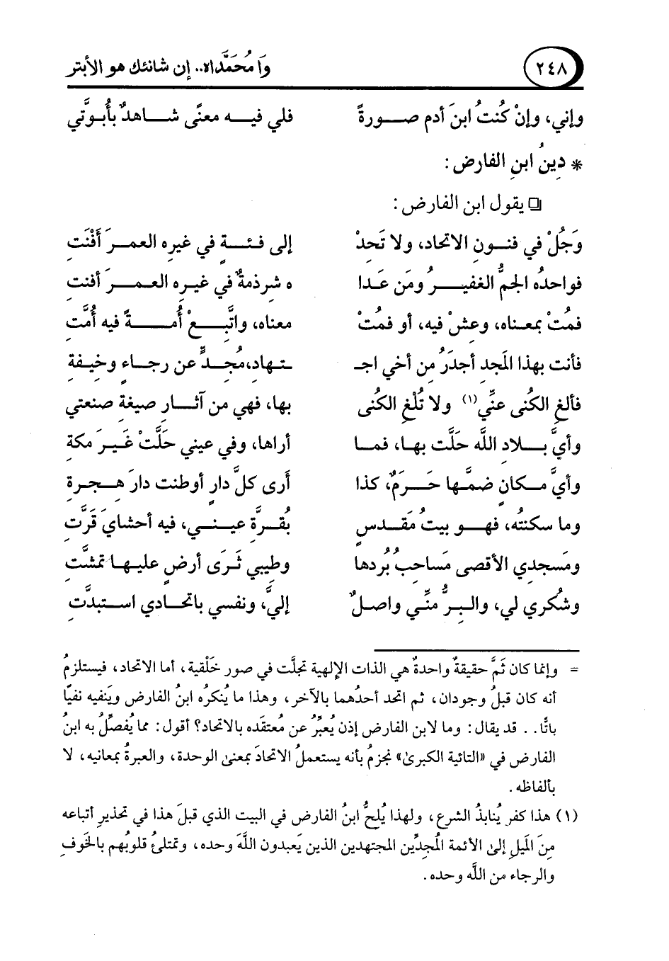 (¬1) هذا كفر يُنابذُ الشرع، ولهذا يُلحُّ ابنُ الفارض في البيت الذي قبلَ هذا في تحذيرِ أتباعه مِنَ المَيلِ إلى الأئمة المُجِدين المجتهدين الذين يَعبدون اللهَ وحده، وتمتلئُ قلوبُهم بالخَوفِ والرجاء من الله وحده.