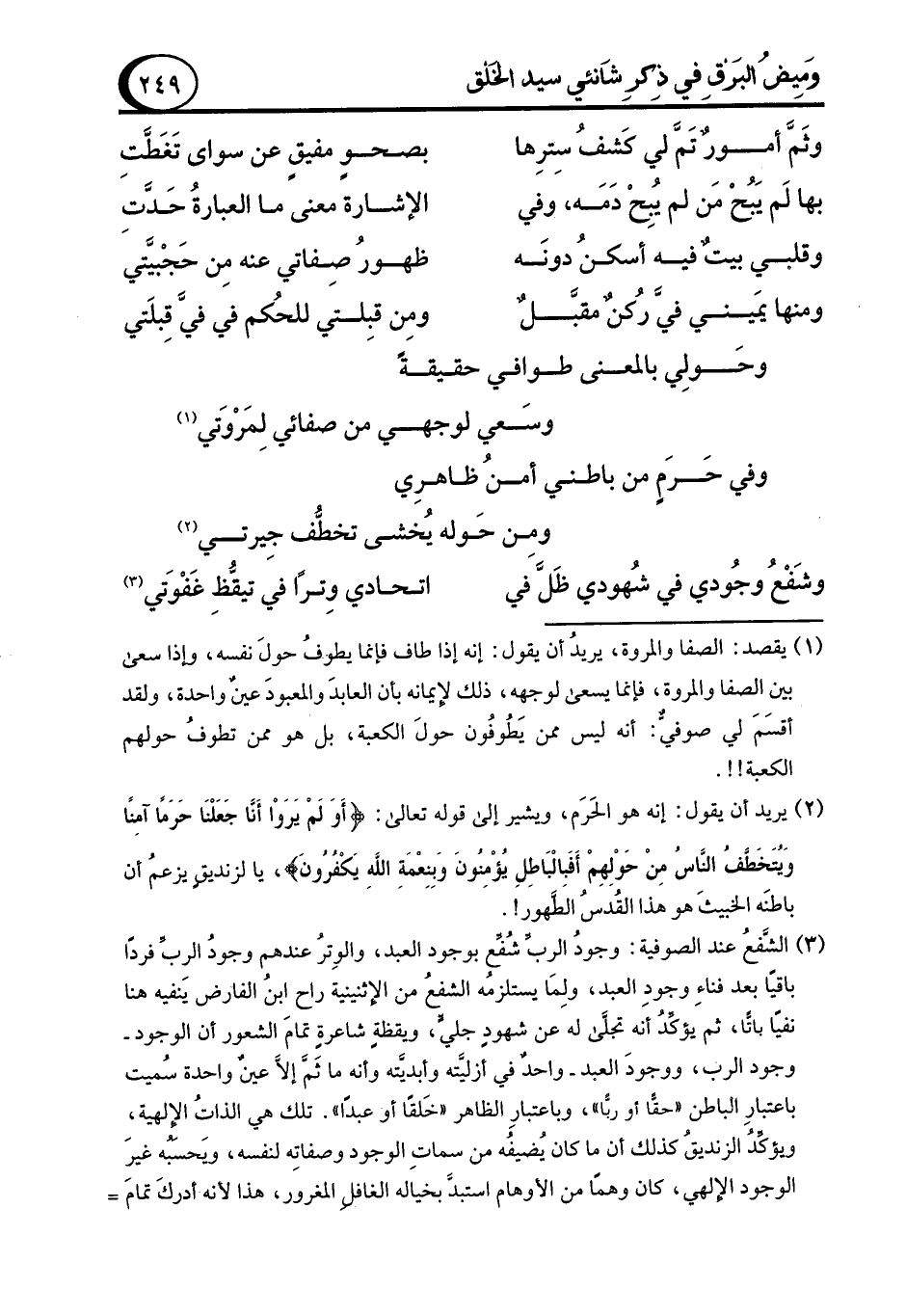 (¬1) يقصد: الصفا والمروة، يريدُ أن يقول: إنه إذا طاف فإنما يطوفُ حولَ نفسه، وإذا سعى بين الصفا والمروة، فإنما يسعى لوجهه، ذلك لإيمانه بأن العابدَ والمعبودَ عينٌ واحدة، ولقد أقسَمَ لي صوفيٌّ: أنه ليس ممن يَطُوفُون حولَ الكعبة، بل هو ممن تطوفُ حولهم الكعبة!!.