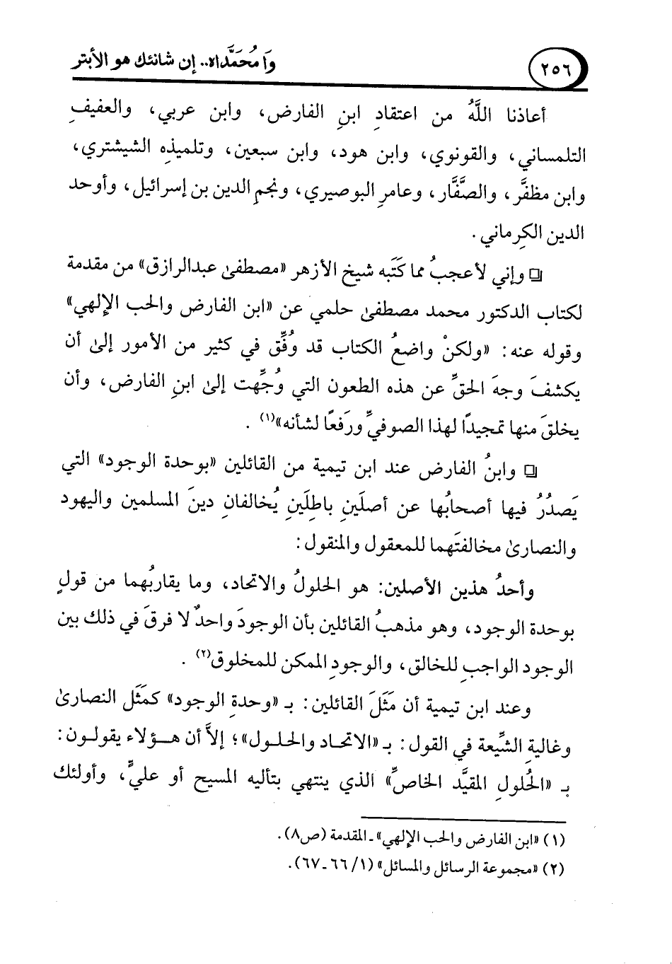 ° وإني لأعجبُ مما كَتَبه شيخ الأزهر "مصطفى عبد الرازق" من مقدمة لكتاب الدكتور محمد مصطفى حلمي عن "ابن الفارض والحب الإلهي" وقوله عنه: "ولكنْ واضعُ الكتاب قد وفِّق في كثير من الأمور إلى أن يكشفَ وجهَ الحقِّ عن هذه الطعون التي وجِّهت إلى ابنِ الفارض، وأن يخلقَ منها تمجيدًا لهذا الصوفيِّ ورَفعًا لشأنه" (¬1).