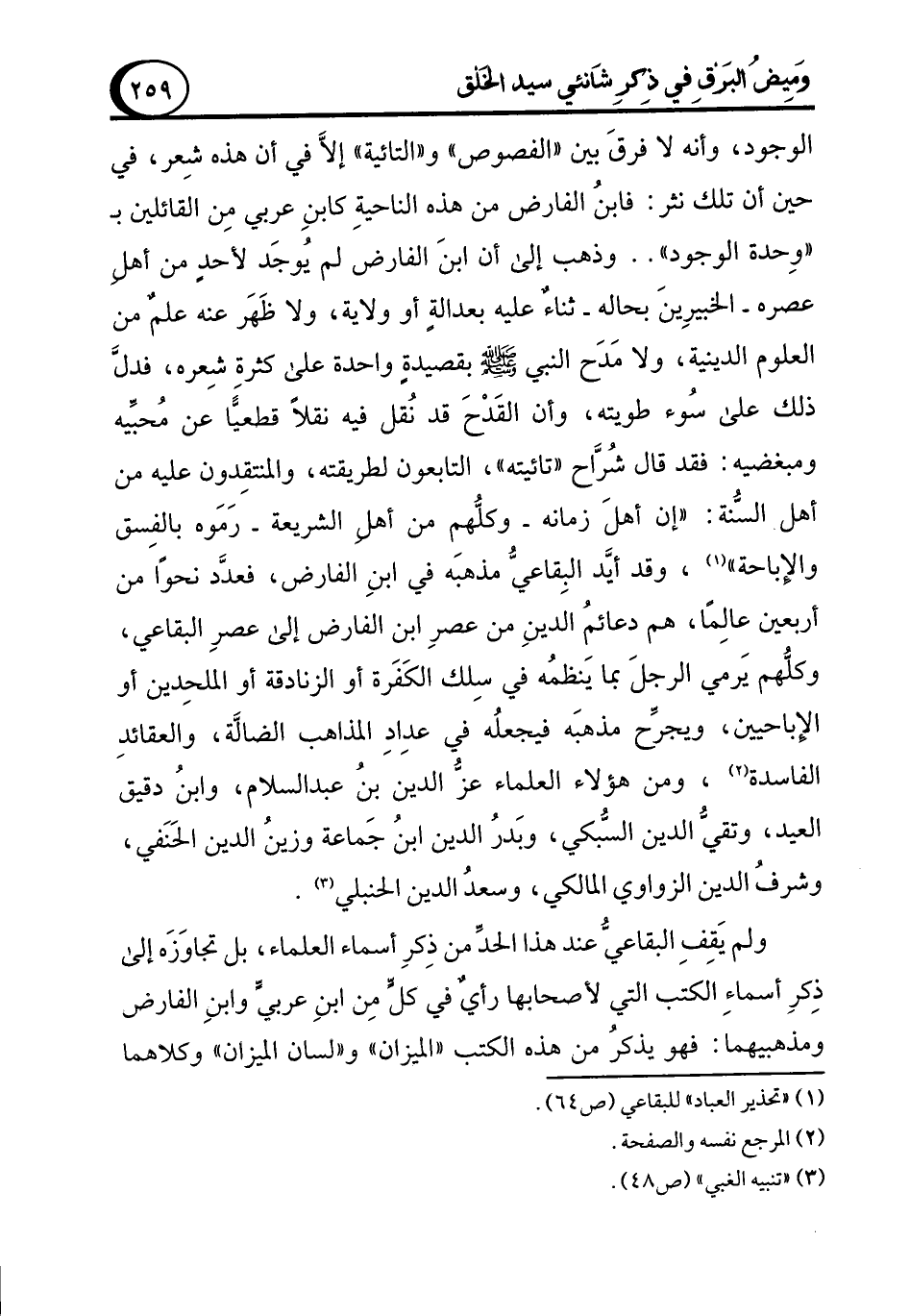 الوجود، وأنه لا فرقَ بين "الفصوص" و"التائية" إلاَّ في أن هذه شِعر، في حين أن تلك نثر: فابنُ الفارض من هذه الناحيةِ كابنِ عربي مِن القائلين بـ "وِحدة الوجود" .. وذهب إلى أن ابنَ الفارض لم يُوجَد لأحدٍ من أهلِ عصره -الخبيرِينَ بحاله- ثناءٌ عليه بعدالةٍ أو ولاية، ولا ظَهَر عنه علمٌ من العلوم الدينية، ولا مَدَح النبي - صلى الله عليه وسلم - بقصيدةٍ واحدة على كثرةِ شعره، فدل ذلك على سُوء طويته، وأن القَدْحَ قد نُقل فيه نقلاً قطعيًّا عن مُحبِّيه ومبغضيه: فقد قال شُرَّاح "تائيته"، التابعون لطريقته، والمنتقِدون عليه من أهل السُنة: "إن أهلَ زمانه -وكلُّهم من أهلِ الشريعة- رَمَوه بالفِسق والإباحة" (¬1)، وقد أيَّد البِقاعيُّ مذهبَه في ابنِ الفارض، فعدَّد نحوًا من أربعين عالِمًا، هم دعائمُ الدينِ من عصرِ ابن الفارض إلى عصرِ البقاعي، وكلهم يَرمي الرجلَ بما يَنظمُه في سِلك الكَفَرة أو الزنادقة أو الملحِدين أو الإباحيين، ويجرحَ مذهبَه فيجعلُه في عدِادِ المذاهب الضالَّة، والعقائدِ الفاسدة (¬2)، ومن هؤلاء العلماء عزُّ الدين بنُ عبد السلام، وابنُ دقيق العيد، وتقيُّ الدين السبكي، وبَدرُ الدين ابنُ جَماعة وزينُ الدين الحَنَفي، وشرفُ الدين الزواوي المالكي، وسعدُ الدين الحنبلي (¬3).