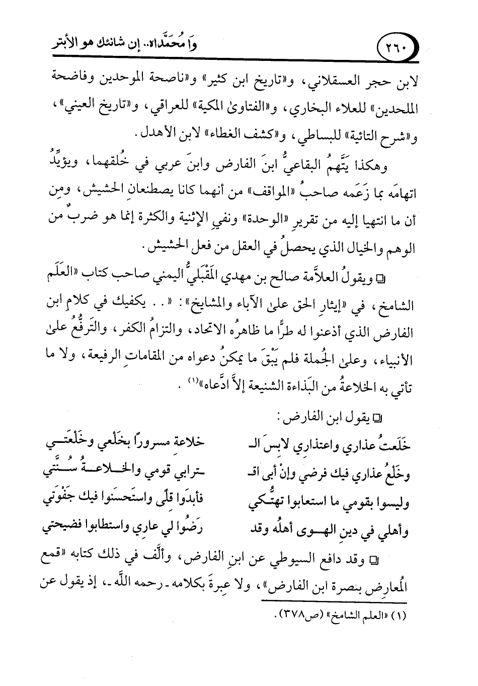 ° وقد دافع السيوطي عن ابنِ الفارض، وألَّف في ذلك كتابه "قمع المُعارض بنصرة ابن الفارض"، ولا عِبرةَ بكلامه - رحمه الله -، إذ يقول عن