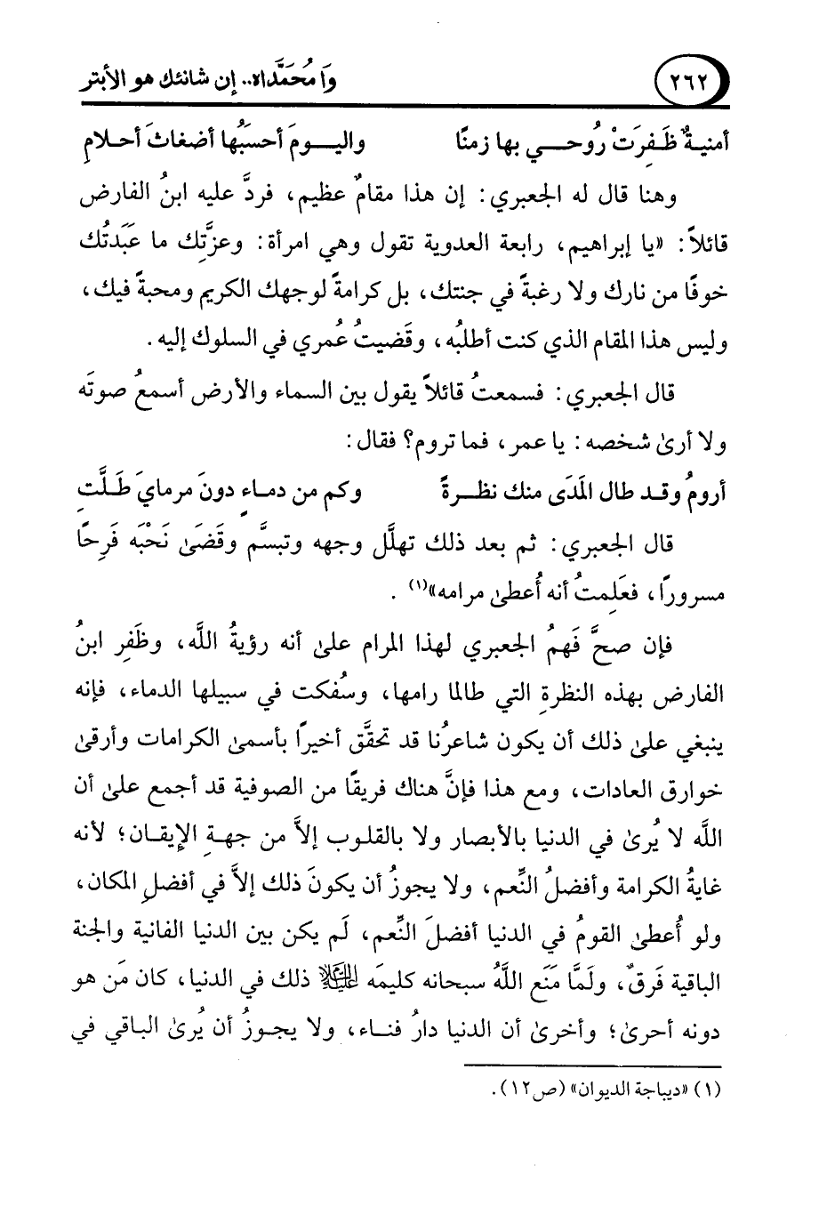 فإن صحَّ فَهمُ الجعبري لهذا المرام على أنه رؤيةُ الله، وظَفِر ابنُ الفارض بهذه النظرةِ التي طالما رامها، وسُفكت في سبيلها الدماء، فإنه ينبغي على ذلك أن يكون شاعرُنا قد تحقَّق أخيرًا بأسمى الكرامات وأرقى خوارق العادات، ومع هذا فإنَّ هناك فريقًا من الصوفية قد أجمع على أن الله لا يُرى في الدنيا بالأبصار ولا بالقلوب إلاَّ من جهةِ الإيقان؛ لأنه غايةُ الكرامة وأفضلُ النِّعم، ولا يجوزُ أن يكونَ ذلك إلاَّ في أفضلِ المكان، ولو أُعطى القومُ في الدنيا أفضلَ النِّعم، لَم يكن بين الدنيا الفانية والجنة الباقية فَرق، ٌ ولَمَّا مَنَع الله سبحانه كليمَه - عليه السلام - ذلك في الدنيا، كان مَن هو دونه أحرى؛ وأخرى أن الدنيا دارُ فناء، ولا يجوزُ أن يُرى الباقي في