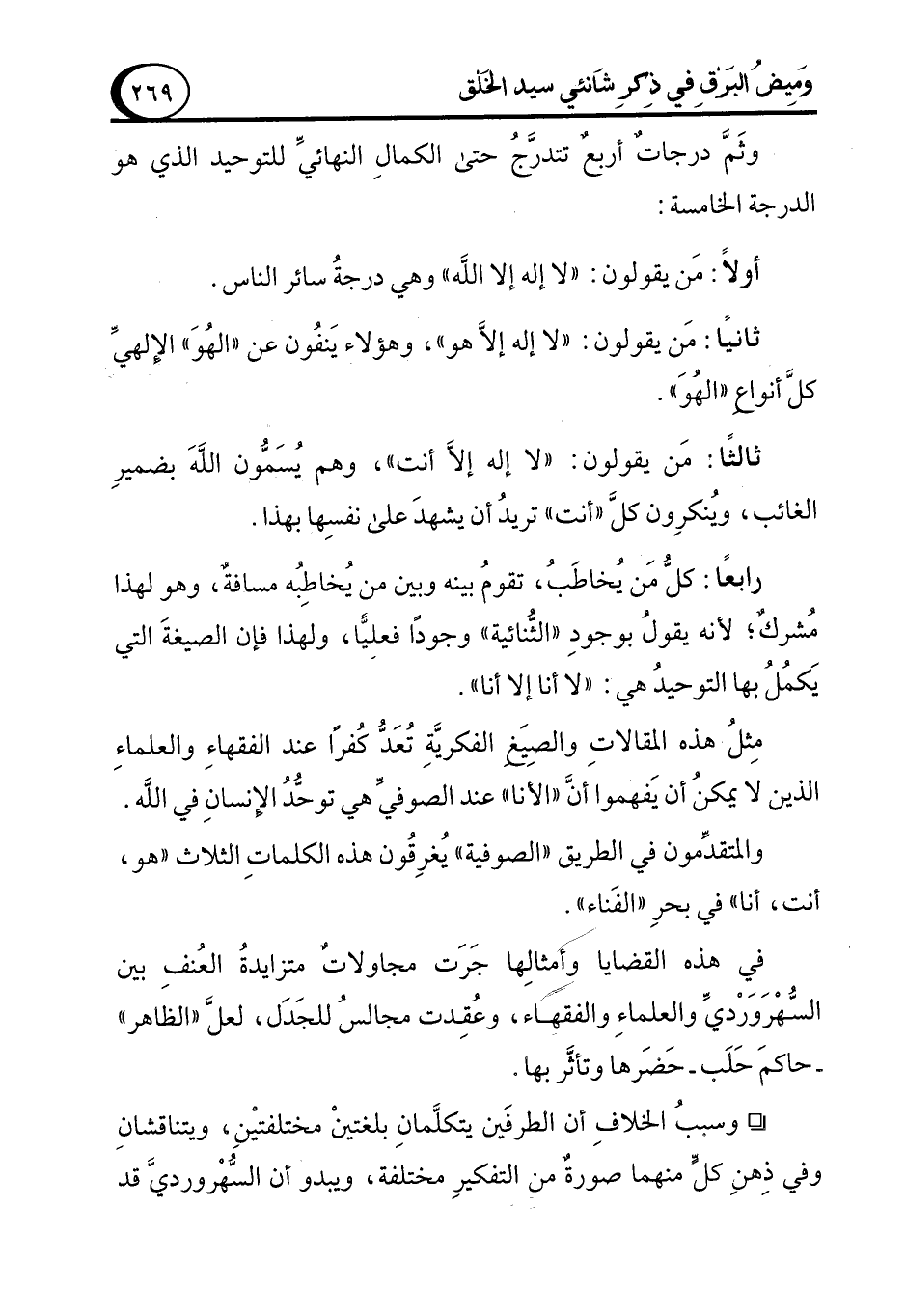 وثَمَّ في درجات أربعٌ تتدرَّج حتى الكمالِ النهائيِّ للتوحيد الذي هو الدرجة الخامسة:
