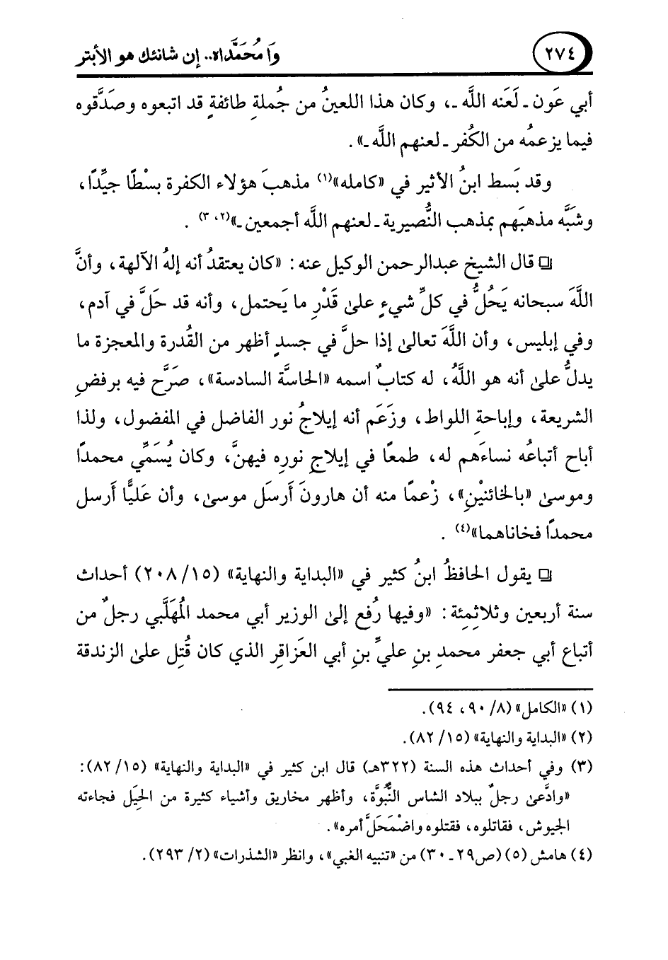 ° يقول الحافظُ ابن كثير في "البداية والنهاية" (15/ 208) أحداث سنة أربعين وثلاثِمِئة: "وفيها رُفع إلى الوزير أبي محمد المُهَلَّبي رجلٌ من أتباع أبي جعفر محمدِ بنِ عليِّ بنِ أبي العَزاقِر الذي كان قُتِل على الزندقة