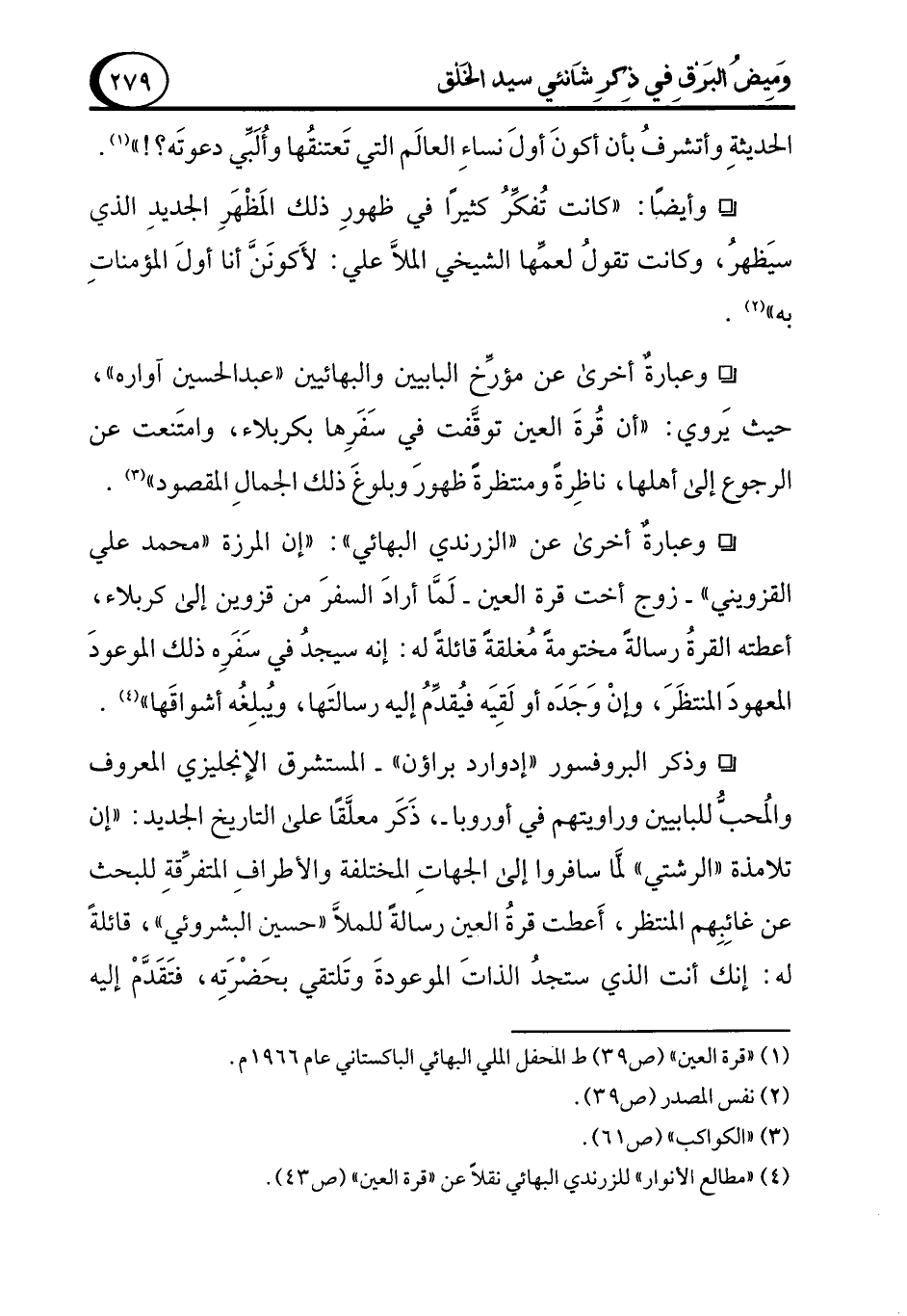 (¬4) "مطالع الأنوار" للزرندي البهائي نقلاً عن "قرة العين" (ص 43).