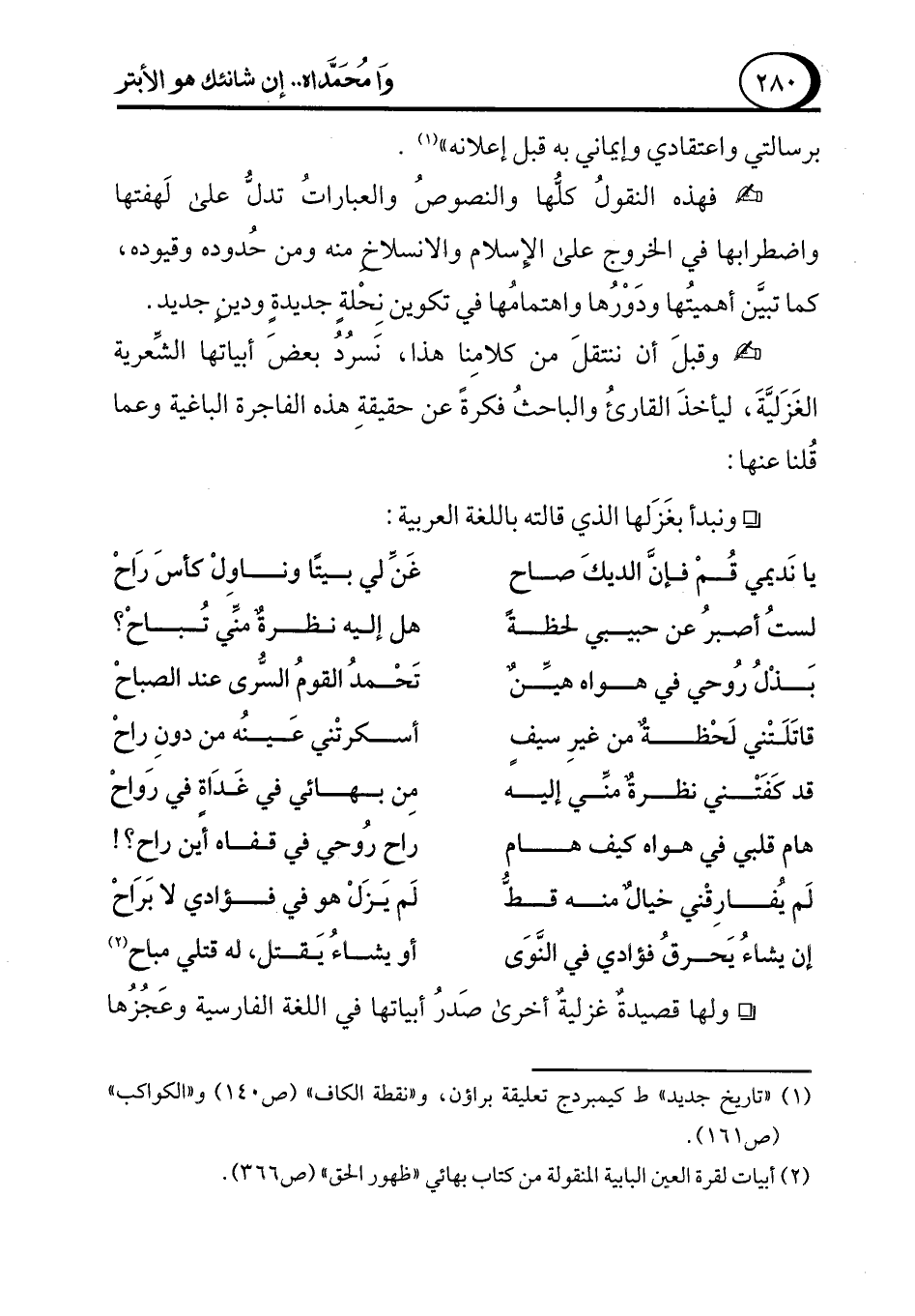 (¬2) أبيات لقرة العين البابية المنقولة من كتاب بهائي "ظهور الحق" (ص 366).