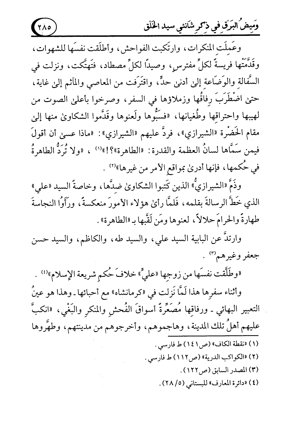 وعَمِلَتِ المنكرات، وارتَكبت الفواحش، وأطلَقت نفسَها للشهوات، وقَدَّمَتْها فريسةً لكلِّ مفترسٍ، وصيدًا لكلِّ مصطاد، فتَهتَّكت، ونزلت في السَّفالةِ والوَضَاعةِ إلى أدنى حدٍّ، واقتَرَفت من المعاصي والمآثم إلى غاية، حتى اضْطَرَبَ رِفاقُها وزملاؤها في السفر، وصرخوا بأعلى الصوت من لهيبها واحتراقِها وطُغيانها، "فسَبُّوها ولَعنوها وقَدَّموا الشكاوى منها إلى مقام الحَضْرة "الشيرازي"، فردَّ عليهم "الشيرازي": "ماذا عسى أن أقولَ فيمن سَمَّاها لسانُ العظمة والقدرة: "الطاهرة"؟! " (¬1)، "ولا تُرَدُّ الطاهرةُ في حُكمها، فإنها أدرى بمواقع الأمر من غيرها" (¬2).