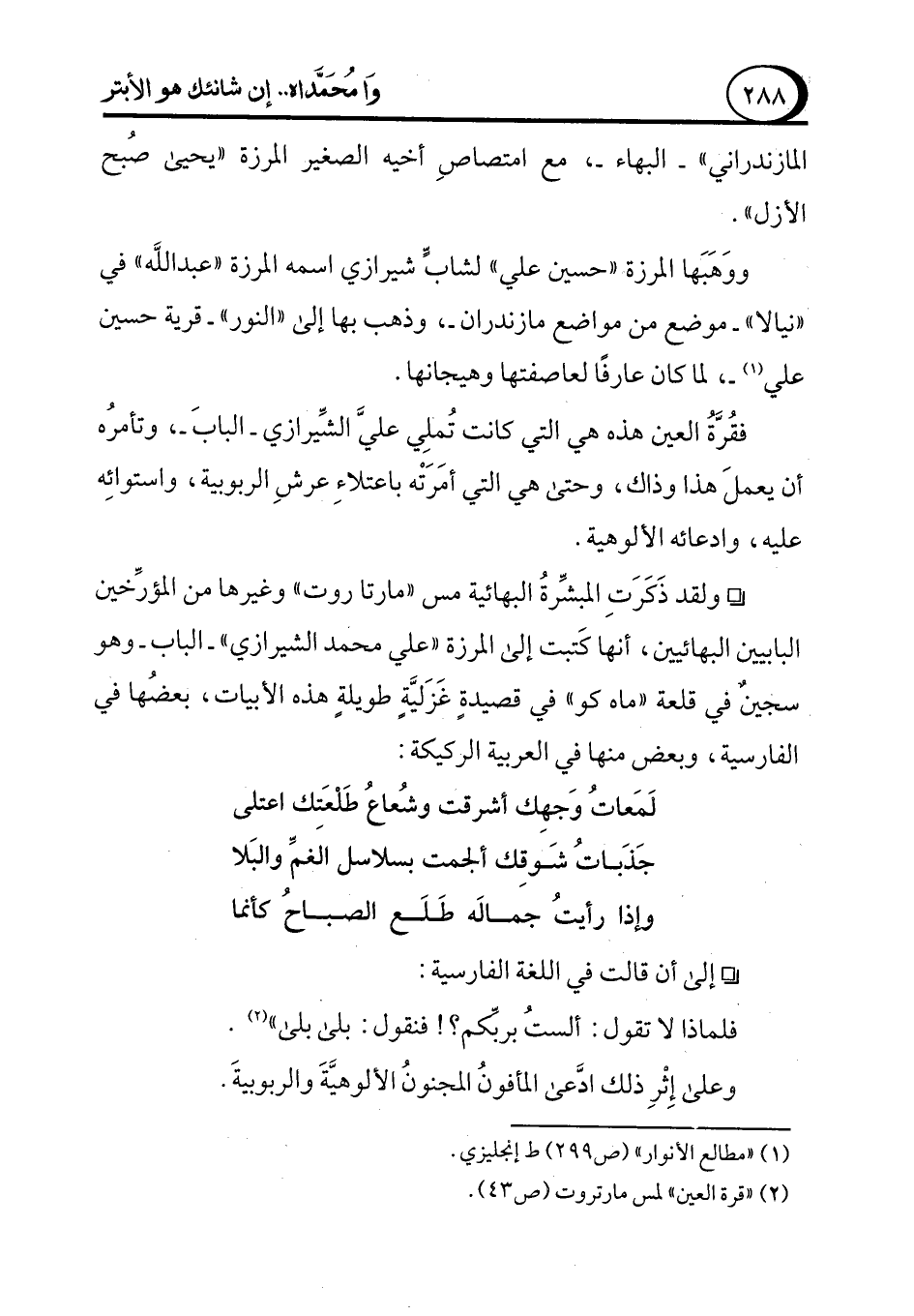فقُرَّةُ العين هذه هي التي كانت تُملِي عليَّ الشِّيرازي -البابَ-، وتأمرُه أن يعملَ هذا وذاك، وحتى هي التي أمَرَتْه باعتلاءِ عرشِ الربوبية، واستوائِه عليه، وادعائه الألوهية.