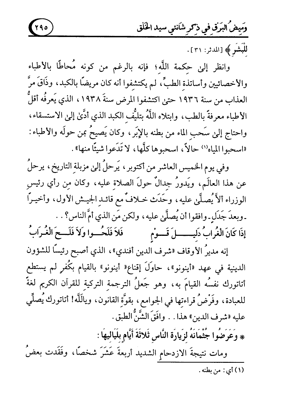 إنه مديرُ الأوقاف "شرف الدين أفندي"، الذي أصبح رئيسًا للشؤون الدينية في عهد "أينونو"، حاوَلَ إقناع "أينونو" بالقيام بكُفرٍ لم يستطع أتاتورك نفسُه القيامَ به، وهو جَعلُ الترجمةِ التركيةِ للقرآن الكريم لغةً للعبادة، وفَرْضُ قراءتِها في الجوامع، بقوَّةِ القانون، ويالَلَّه! أتاتورك يُصلِّي عليه "شرف الدين" هذا .. وافَق الشَّنُّ الطبق.