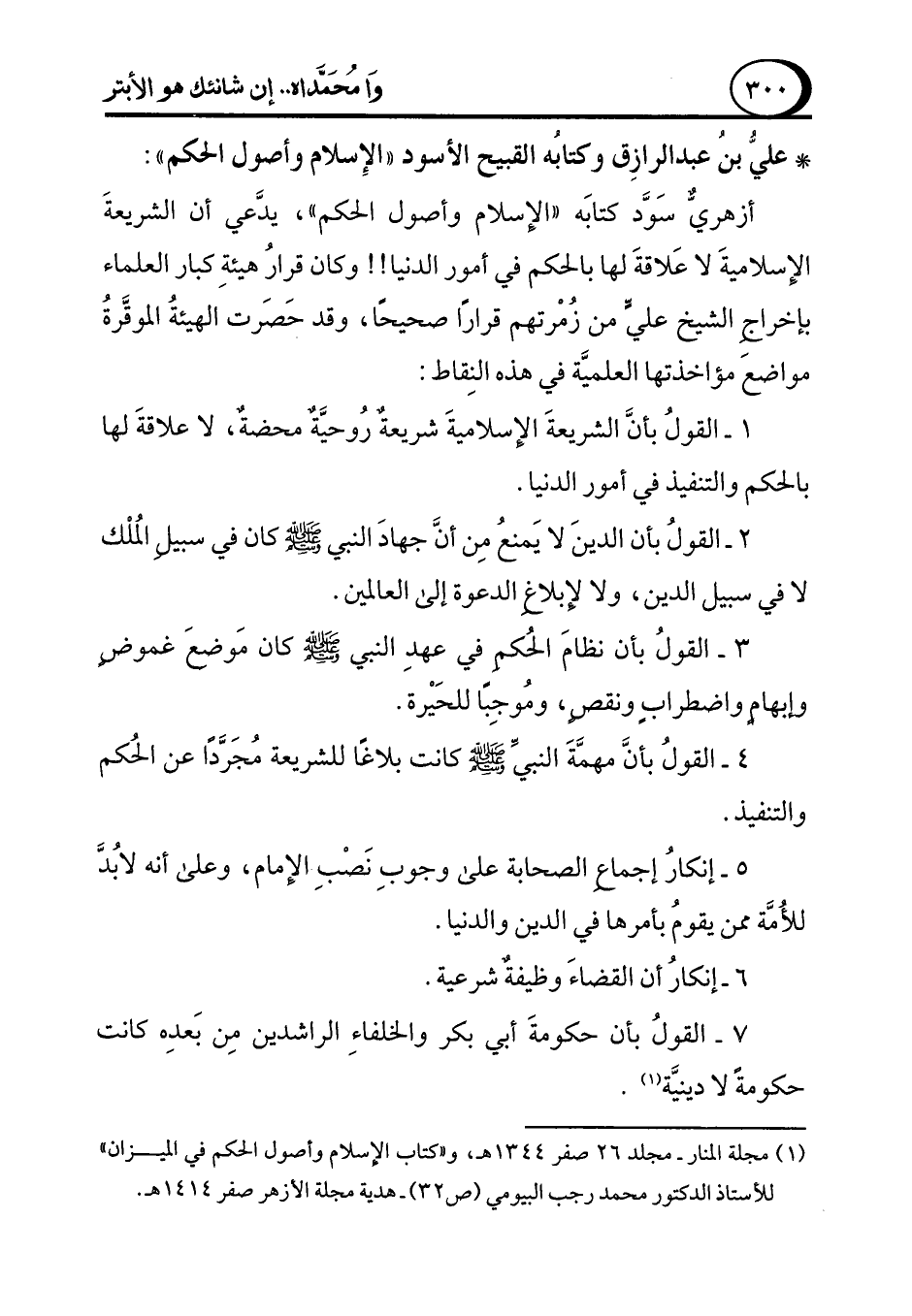 أزهريٌّ سَوَّد كتابَه "الإسلام وأصول الحكم"، يدَّعي أن الشريعةَ الإسلاميةَ لا عَلاقةَ لها بالحكم في أمور الدنيا!! وكان قرارُ هيئةِ كبار العلماء بإخراجِ الشيخ عليٍّ من زُمْرتهم قرارًا صحيحًا، وقد حَصَرت الهيئةُ الموقَّرةُ مواضعَ مؤاخذتها العلميَّة في هذه النِقاط: