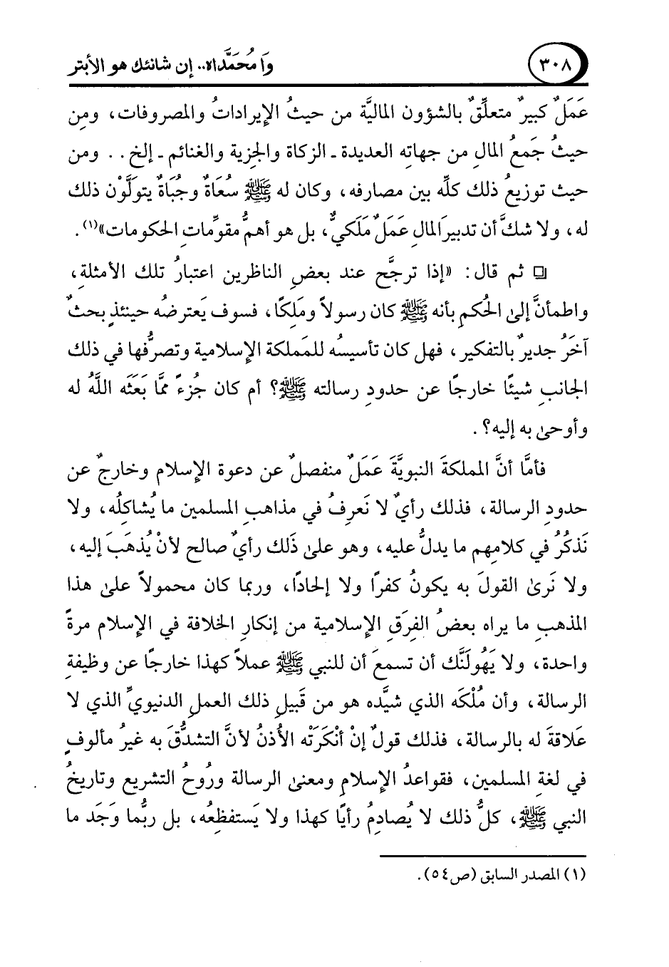 فأمَّا أنَّ المملكةَ النبويَّةَ عَمَلٌ منفصلٌ عن دعوة الإسلام وخارجٌ عن حدودِ الرسالة، فذلك رأيٌ لا نَعرِف في مذاهبِ المسلمين ما يُشاكِلُه، ولا نَذكُرُ في كلامِهم ما يدلُّ عليه، وهو على ذَلك رأيٌ صالح لأنْ يُذهَبَ إليه، ولا نَرى القولَ به يكونُ كفرًا ولا إلحادًا، وربما كان محمولاً على هذا المذهبِ ما يراه بعضُ الفِرَقِ الإسلامية من إنكارِ الخلافة في الإسلام مرةً واحدة، ولا يَهُولَنَّك أن تسمعَ أن للنبي - صلى الله عليه وسلم - عملاً كهذا خارجًا عن وظيفةِ الرسالة، وأن مُلْكَه الذي شيَّده هو من قَبيل ذلك العمل الدنيويِّ الذي لا عَلاقةَ له بالرسالة، فذلك قولٌ إنْ أنْكَرَتْه الأُذن لأنَّ التشدُّقَ به غيرُ مألوف في لغةِ المسلمين، فقواعدُ الإسلام ومعني الرسالة ورُوحُ التشريع وتاريخُ النبي - صلى الله عليه وسلم -، كلُّ ذلك لا يُصادِمُ رأيًا كهذا ولا يَستفظِعُه، بل ربُّما وَجَد ما