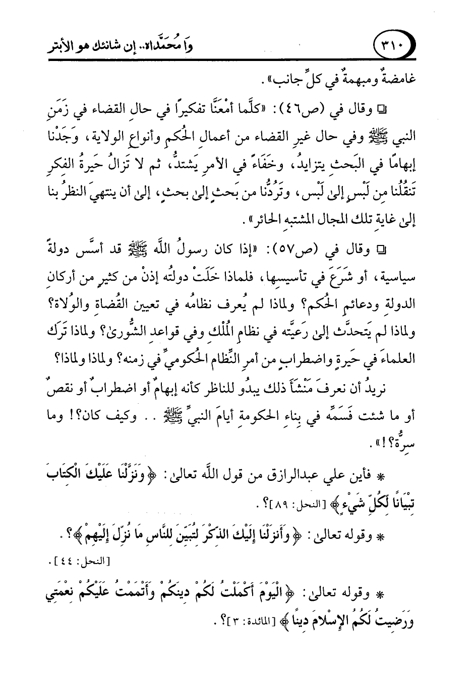° وقال في (ص 57): "إذا كان رسولُ الله - صلى الله عليه وسلم - قد أسَّس دولةً سياسية، أو شَرعَ في تأسيسِها، فلماذا خَلَتْ دولتُه إذنْ من كثيرٍ من أركانِ الدولةِ ودعائمِ الحكم؟ ولماذا لم يُعرف نظامُه في تعيين القُضاةِ والوُلاة؟ ولماذا لم يَتحدَّث إلى رَعيَّته في نظام المُلْكِ وفي قواعدِ الشُّورى؟ ولماذا تَرَك العلماءَ في حَيرةٍ واضطرابٍ من أمرِ النِّظام الحُكوميِّ في زمنه؟ ولماذا ولماذا؟