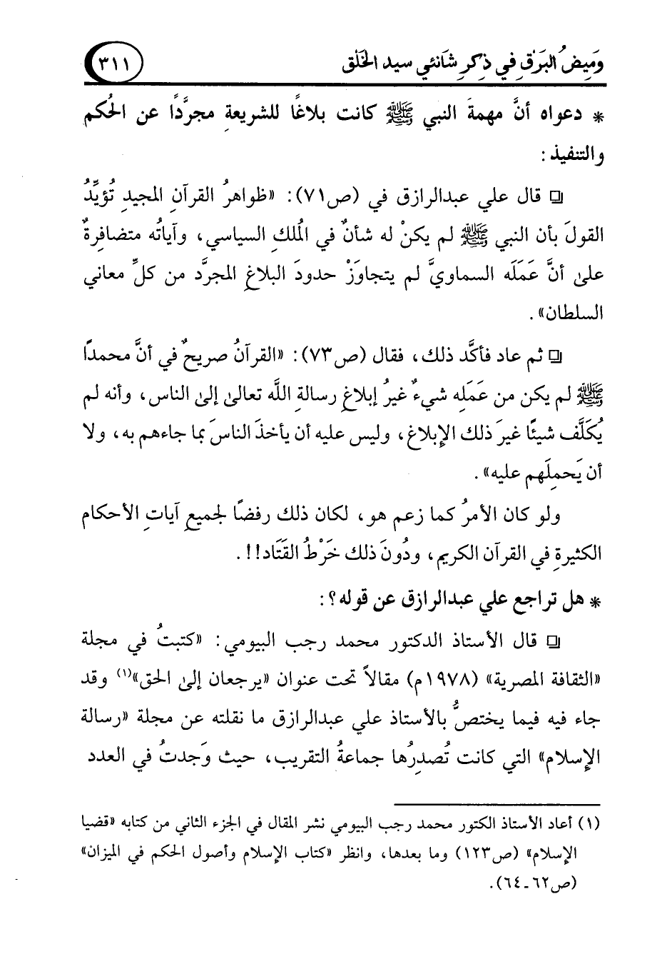 ° قال علي عبد الرازق في (ص 71): "ظواهرُ القرآنِ المجيدِ تُؤيِّدُ القولَ بأن النبي - صلى الله عليه وسلم - لم يكنْ له شأنٌ في المُلكِ السياسي، وآياتُه متضافِرةٌ على أنَّ عَمَلَه السماويَّ لم يتجاوَزْ حدودَ البلاغِ المجرَّد من كلِّ معاني السلطان".