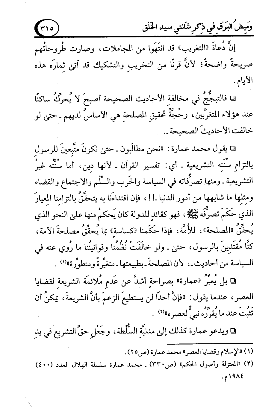 ° يقول محمد عمارة: "نحن مطالَبون حتى نكونَ متَبِعينَ للرسولِ بالتزام سنَنِه التشريعية -أي: تفسير القرآن- لأنها دِين، أما سُنته غيرُ التشريعية -ومنها تصرُّفاته في السياسة والحَرب والسِّلْم والاجتماع والقضاء ومِثلِها ما شابهها من أمور الدنيا-!!، فإن اقتداءَنا به يتحققُ بالتزامِنا المِعيارَ الذي حَكَمَ تصرُّفه - صلى الله عليه وسلم -، فهو كقائدٍ للدولة كان يَحكم منها على النحو الذي يحقِّقُ "المصلحة"، للأُمَّة، فإذا حَكَمنا "كساسةٍ" بما يُحققُ مصلحةَ الأمة، كنَّا مُقتَدِينَ بالرسول، حتى -ولو خالفَتْ نُظُمُنا وقوانينُنا ما رُوي عنه في السياسة من أحاديث-، لأن المصلحةَ -بطبيعتها- متغيرةٌ ومتطوِّرة" (¬1).