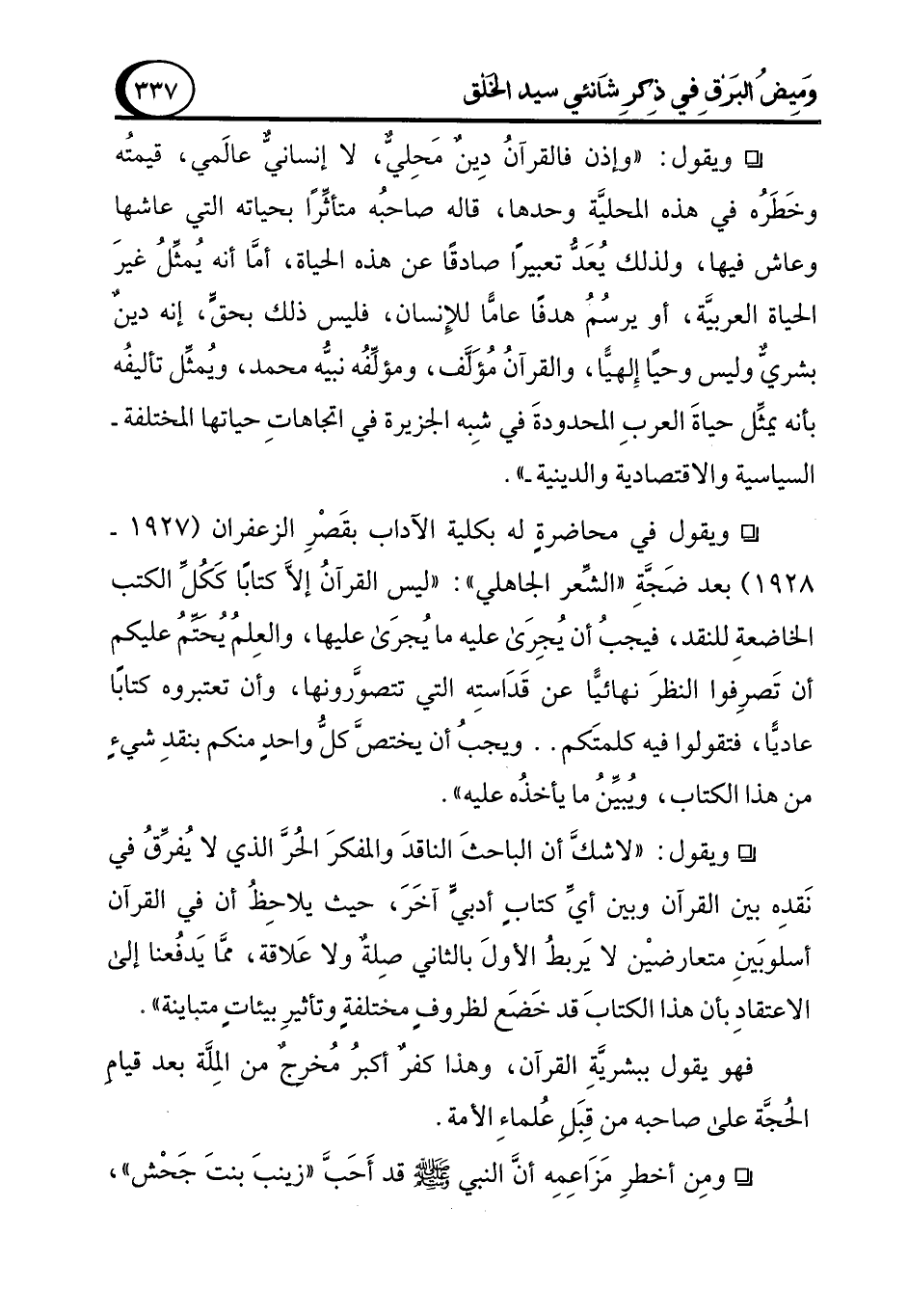 ° ويقول: "لا شكَّ أن الباحثَ الناقدَ والمفكرَ الحُرَّ الذي لا يُفرِّقُ في نَقدِه بين القرآن وبين أيِّ كتابٍ أدبيٍّ آخَرَ، حيث يلاحِظُ أن في القرآن أسلوبَينِ متعارضيْن لا يَربطُ الأولَ بالثاني صِلةٌ ولا عَلاقة، ممَّا يَدفُعنا إلى الاعتقادِ بأن هذا الكتابَ قد خضع لظروفٍ مختلفةٍ وتأثيرِ بيئاتٍ متباينة".