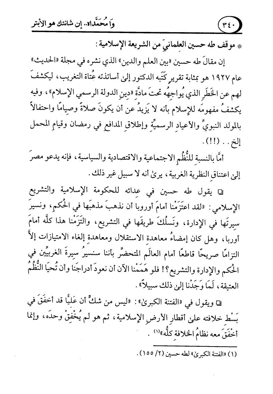 ° يقول طه حسين في عِدائه للحكومة الإِسلامية والتشريعِ الإِسلامي: "لقد اعتَزَمْنا أمامَ أوروبا أن نذهبَ مذهبَها في الحُكم، ونسير سِيرتَها في الإدارة، ونَسلُكَ طريقَها في التشريع، والتَزَمْنا هذا كلَّه أمامَ أوربا، وهل كان إمضاءُ معاهدةِ الاستقلال ومعاهدةِ إلغاء الامتيازات إلاَّ التزامًا صريحًا قاطعًا أمام العالَم المتحضِّر بأننا سنسيرُ سِيرةَ الغربيِّين في الحُكم والإِدارة والتشريع؟! فلو هَمَمْنا الآن أن نعودَ أدراجَنا وأن تُحيَا النُّظُمُ العتيقة، لَمَا وَجَدْنا إلى ذلك سبيلاً".