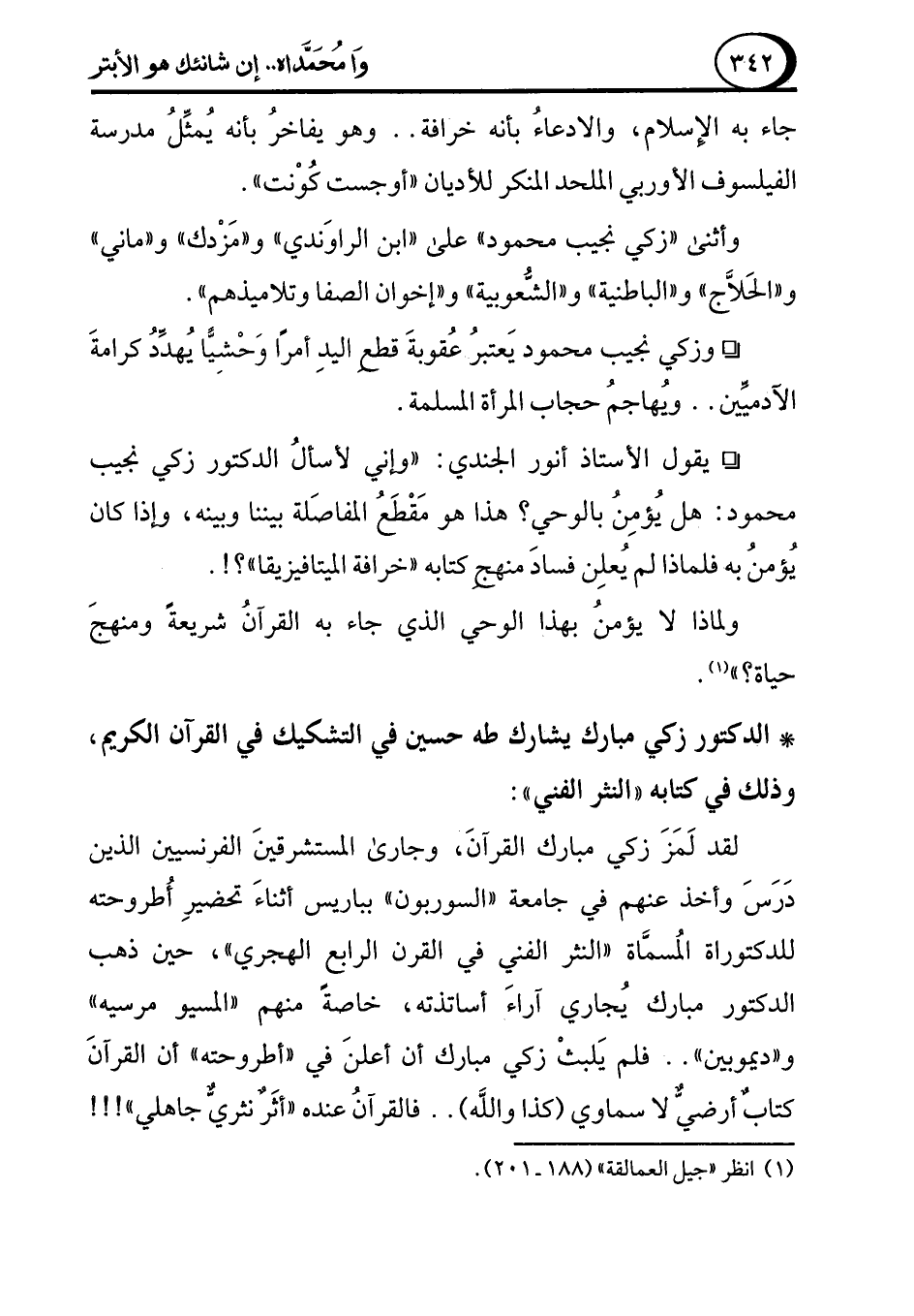 * الدكتور زكي مبارك يشارك طه حسين في التشكيك في القرآن الكريم، وذلك في كتابه "النثر الفني":