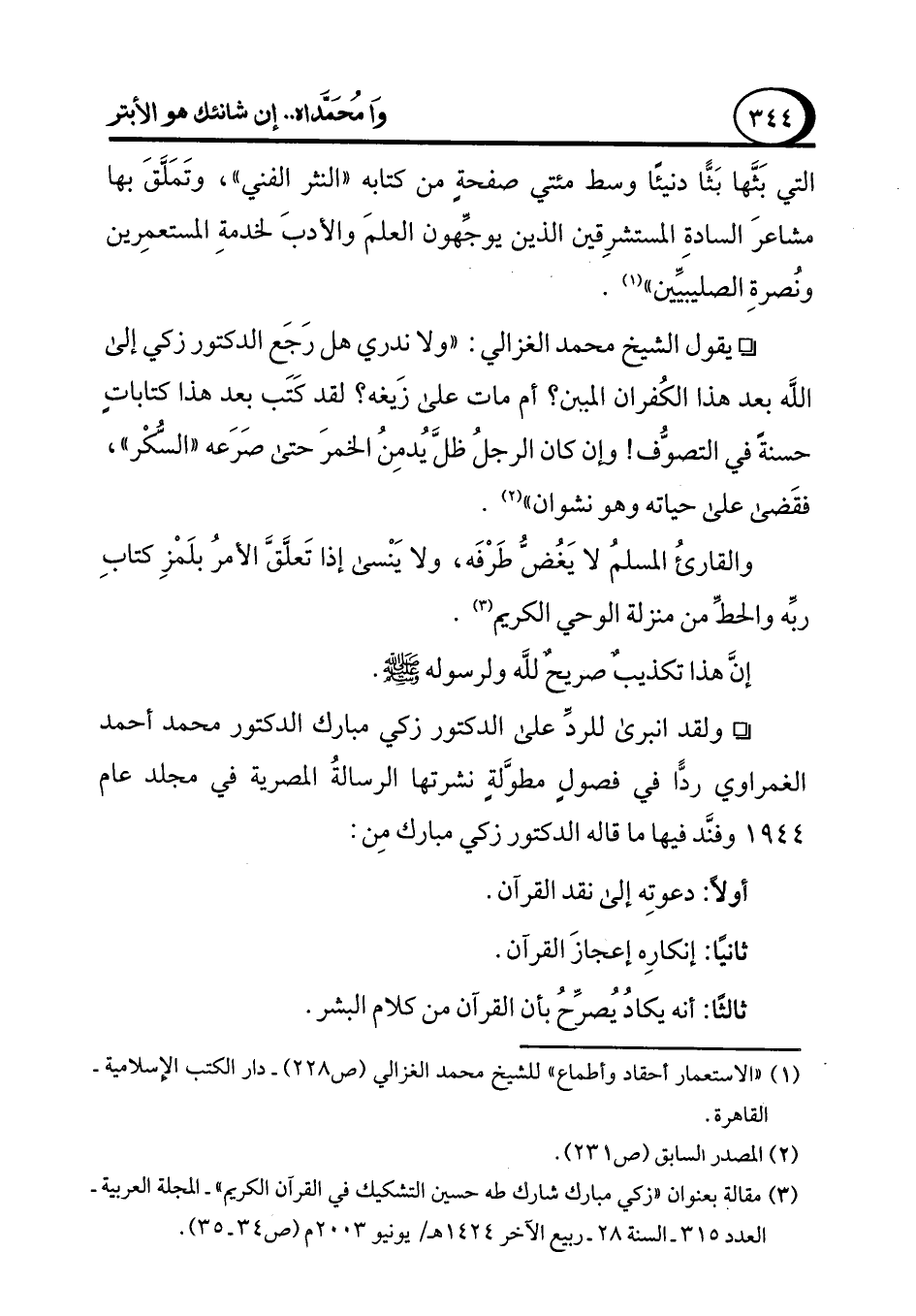 (¬3) مقالة بعنوان "زكي مبارك شارك طه حسين التشكيك في القرآن الكريم" - المجلة العربية - العدد 315 - السنة 28 - ربيع الآخر 1424 هـ/ يونيو 2003 م (ص 34 - 35).