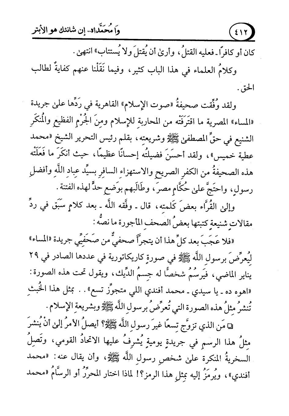 "فلا عَجَبَ بعد كلِّ هذا أن يتجرَّأَ صحفيٌّ من صَحَفِيِّي جريدة "المساء" لِيُعرِّضَ برسولِ الله - صلى الله عليه وسلم - في صورةٍ كاريكاتورية في عددها الصادر في 29 يناير الماضي، فيَرسُمُ شخصًّا له جِسمُ الدِّيك، ويقول تحت هذه الصورة: