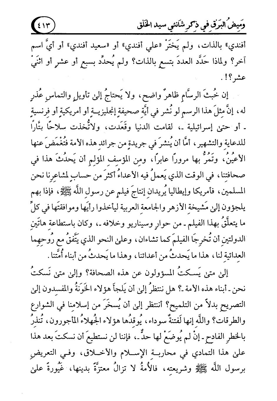 إن خُبثَ الرسَّام ظاهرٌ واضح، ولا يَحتاجُ إلى تأويلٍ والتماسِ عُذرٍ له، إنَّ مِثلَ هذا الرسم لو نُشر في أيَّةِ صحيفةٍ إنجليزيةٍ أو أمريكيةٍ أو فِرنسيةٍ -أو حتى إسرائيلية-، لقامت الدنيا وقَعَدت، ولاتُّخذت سلاحًا بتَّارًا للدعايةِ والتشهير، أمَّا أن يُنشرَ في جريدةٍ من جرائدِ هذه الأمة فتُغْمَضَ عنها الأعيُنُ، وتَمُرُّ بها مرورًا عابرًا، ومِن المؤسِفِ المؤلِمِ أن يَحدُثَ هذا في صحافتِنا، في الوقت الذي يَعملُ فيه الأعداءُ أكثرَ من حسابٍ لمشاعِرِنا نحن المسلمين، فأمريكا وإيطاليا يُريدانِ إنتاجَ فيلمٍ عن رسولِ الله - صلى الله عليه وسلم -، فإذا بهم يلجؤون إلى مَشيخةِ الأزهر والجامعةِ العربية ليأخذوا رأيَها وموافقتَها في كلِّ ما يتعلَّقُ بهذا الفيلم -من حوارٍ وسيناريو وخلافه-، وكان باستطاعةِ هاتَينِ الدولتينِ أن تُخرِجَا الفيلمَ كما تشاءان، وعلى النحو الذي يَتَّفق مع رُوحِهِما العِدائيةِ لنا، هذا ما يَحدثُ من أعدائنا، وهذا ما يَحدثُ من أبناء أُمَّتنا.