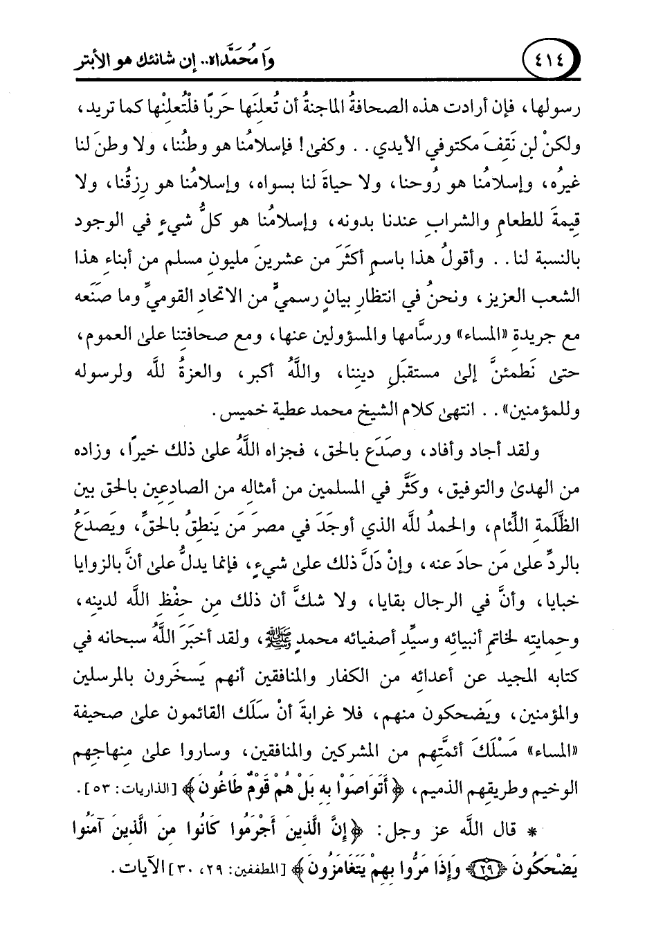 رسولها، فإن أرادت هذه الصحافةُ الماجنةُ أن تُعلِنَها حَربًا فلْتُعلِنْها كما تريد، ولكنْ لن نَقِفَ مكتوفي الأيدي .. وكفى! فإسلامُنا هو وطنُنا، ولا وطنَ لنا غيرُه، وإسلامُنا هو رُوحنا، ولا حياةَ لنا بسواه، وإسلامُنا هو رِزقُنا، ولا قِيمةَ للطعامِ والشرابِ عندنا بدونه، وإسلامُنا هو كلُّ شيءٍ في الوجود بالنسبة لنا .. وأقولُ هذا باسم أكثَرَ من عشرينَ مليونِ مسلم من أبناءِ هذا الشعب العزيز، ونحنُ في انتظارِ بيانٍ رسميٍّ من الاتحادِ القوميِّ وما صَنَعه مع جريدةِ "المساء" ورسَّامها والمسؤولين عنها، ومع صحافتِنا على العموم، حتى نَطمئنَّ إلى مستقبَل دينِنا، واللهُ أكبر، والعزةُ لله ولرسوله وللمؤمنين" .. انتهى كلام الشيخ محمد عطية خميس.