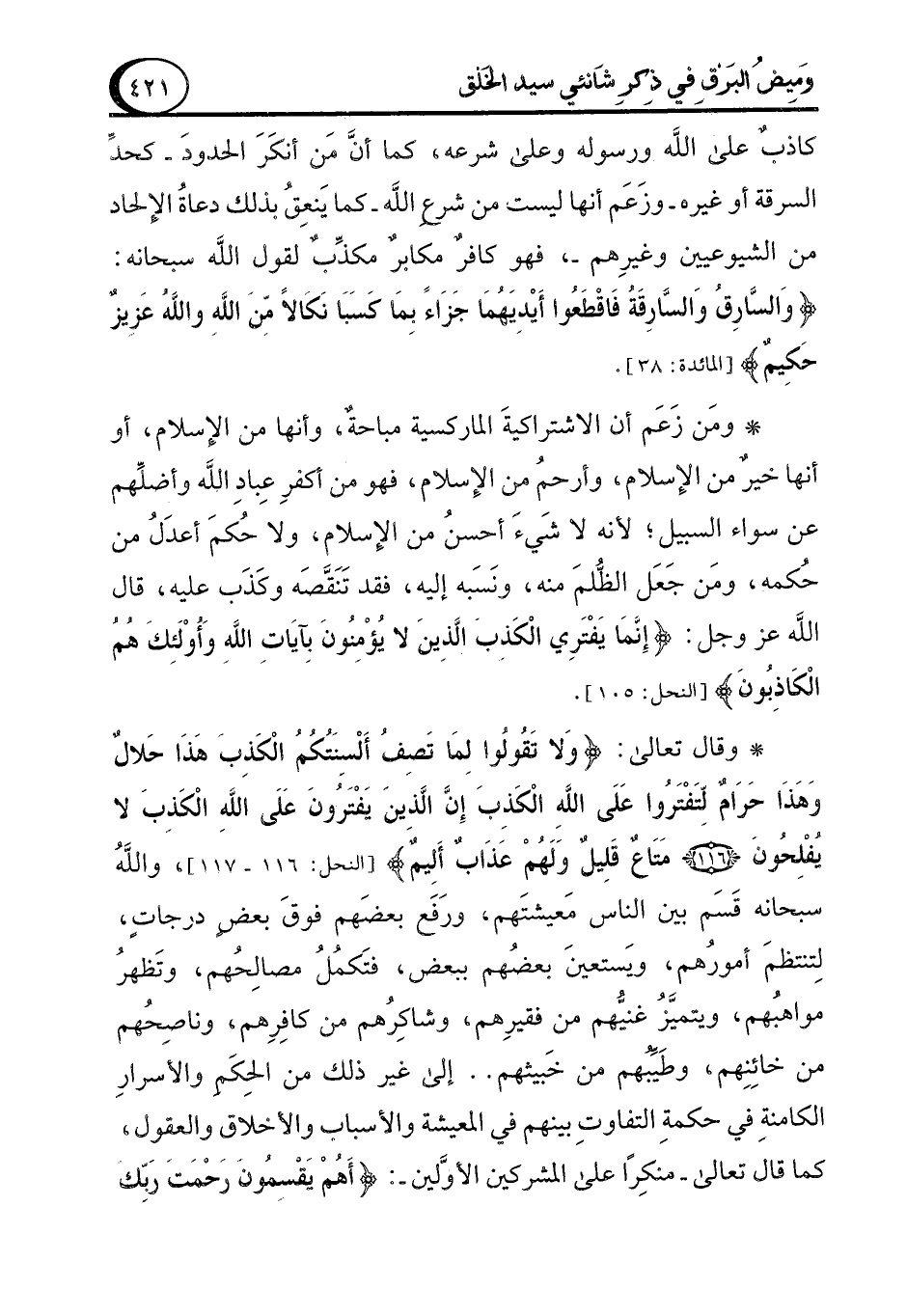 * ومن زعم أن الاشتراكية الماركسية مباحةٌ، وأنها من الإِسلام، أو أنها خيرٌ من الإِسلام، وأرحمُ من الإِسلام، فهو من أكفرِ عباد الله وأضلِّهم عن سواء السبيل؛ لأنه لا شيءَ أحسنُ من الإِسلام، ولا حكَمَ أعدَلُ من حكمه، ومَن جَعَل الظُّلمَ منه، ونَسَبه إليه، فقد تَنَقَّصَه وكَذَب عليه، قال الله عز وجل: {إِنَّمَا يَفْتَرِي الْكَذِبَ الَّذِينَ لَا يُؤْمِنُونَ بِآيَاتِ اللَّهِ وَأُولَئِكَ هُمُ الْكَاذِبُونَ} [النحل: 105].