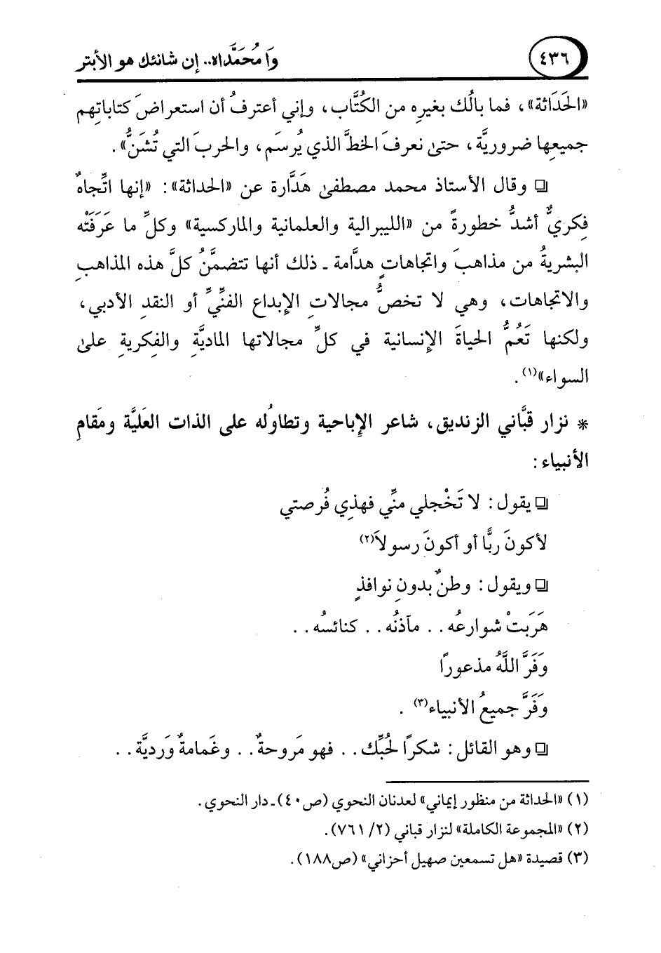 * نزار قبَّاني الزنديق، شاعر الإِباحية وتطاوُله على الذات العَليَّة ومَقامِ الأنبياء: