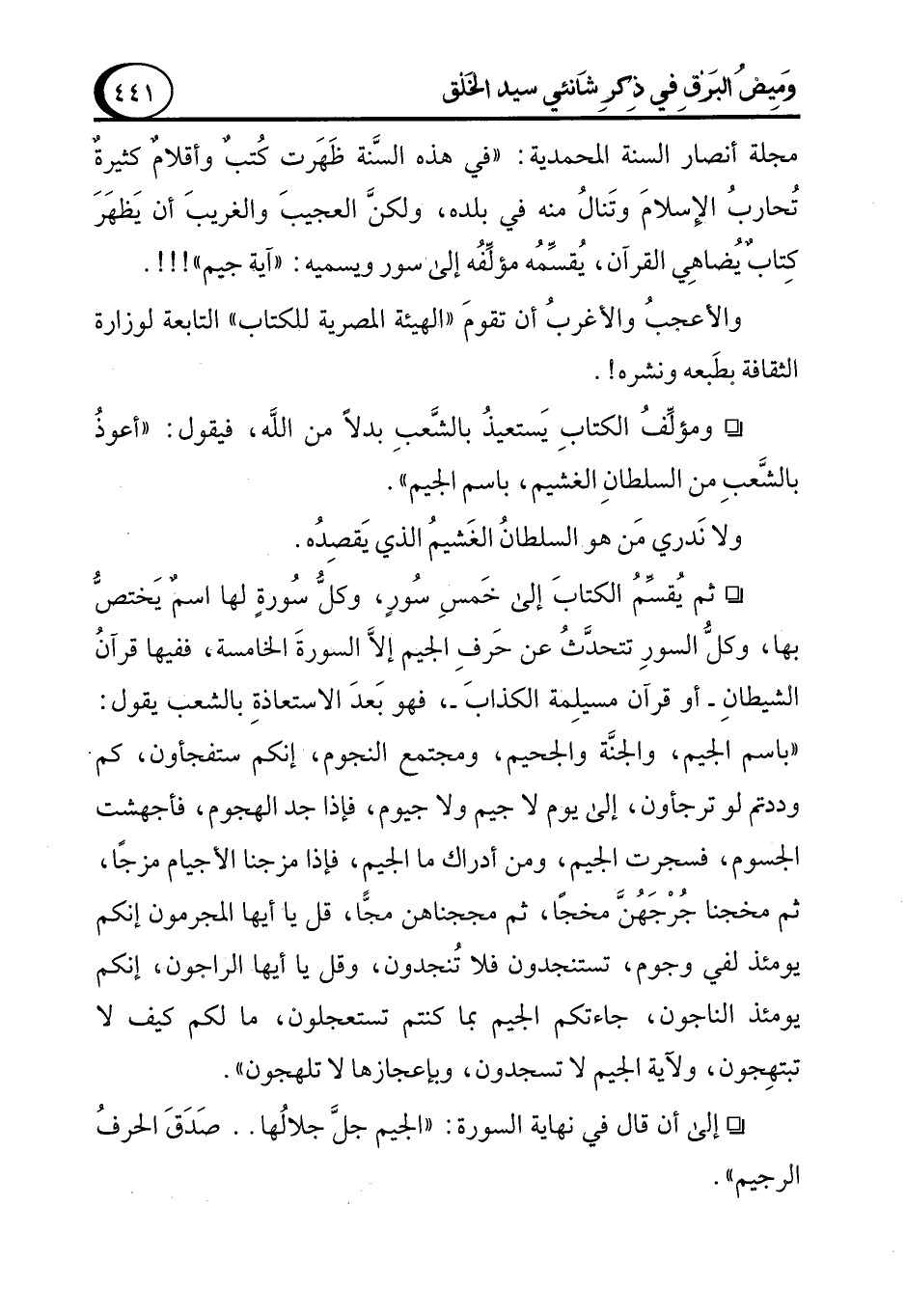 مجلة أنصار السنة المحمدية: "في هذه السَّنة ظَهَرت كُتبٌ وأقلامٌ كثيرةٌ تُحاربُ الإِسلامَ وتَنالُ منه في بلده، ولكنَّ العجيبَ والغريبَ أن يَظهَرَ كِتابٌ يُضاهِي القرآن، يُقسِّمُه مؤلِّفُه إلى سور ويسميه: "آية جيم"!!!.