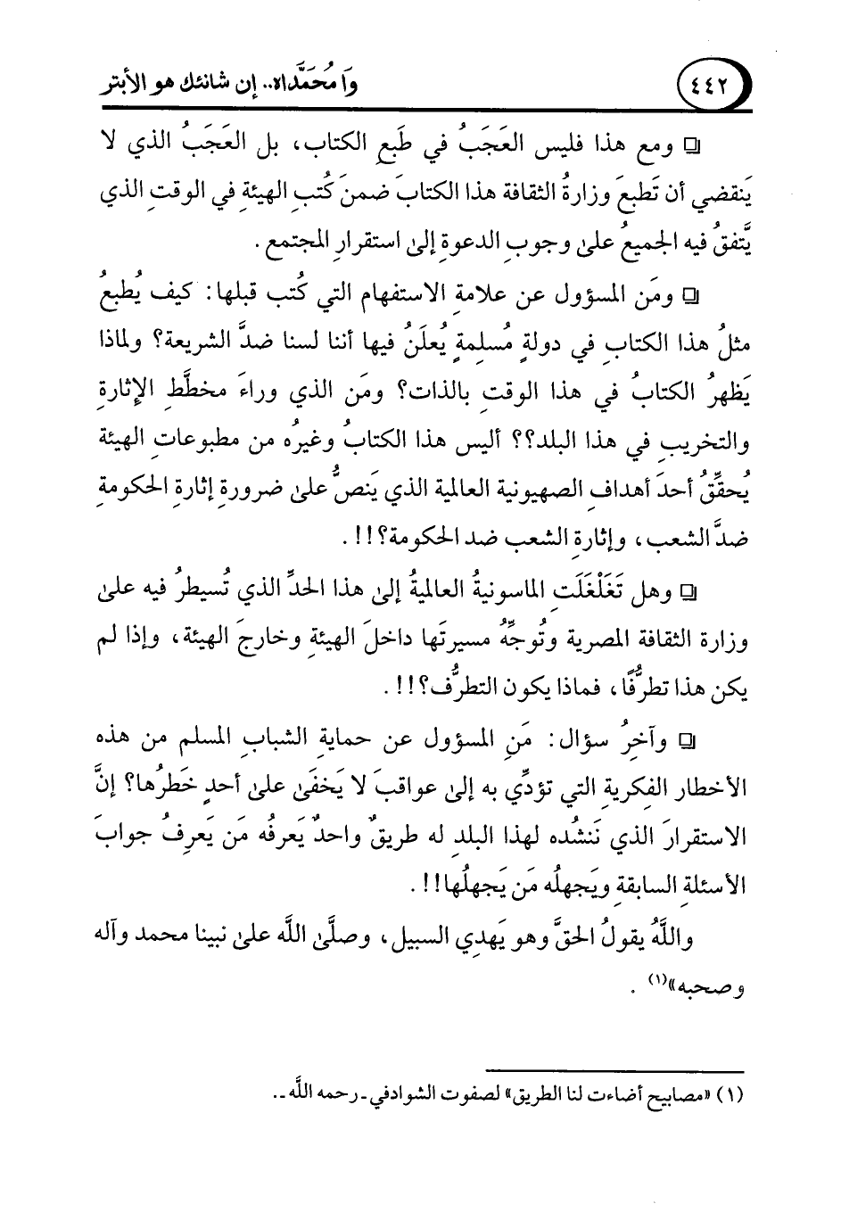 ° ومع هذا فليس العَجَبُ في طَبعِ الكتاب، بل العَجَبُ الذي لا يَنقضي أن تَطبعَ وزارةُ الثقافة هذا الكتابَ ضمنَ كتبِ الهيئةِ في الوقتِ الذي يتَّفقُ فيه الجميعُ على وجوبِ الدعوةِ إلى استقرارِ المجتمع.