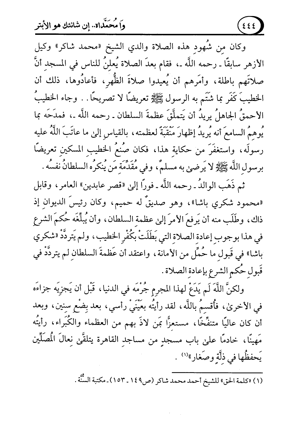 وكان مِن شُهودِ هذه الصلاة والدي الشيخ "محمد شاكر" وكيل الأزهر سابقًا - رحمه الله -، فقام بعدَ الصلاة يُعلِنُ للناس في المسجدِ أنَّ صلاتَهم باطلة، وأمَرهم أن يُعيدوا صلاةَ الظُّهرِ، فأعادُوها، ذلك أن الخطيبَ كَفَر بما شَتَم به الرسول - صلى الله عليه وسلم - تعريضًا لا تصريحًا .. وجاء الخطيبُ الأحمقُ الجاهلُ يريدُ أن يَتملَّقَ عظمةَ السلطان - رحمه الله -، فمدَحَه بما يُوهِمُ السامعَ أنه يريدُ إظهارَ مَنْقَبَةً لعظمته، بالقياسِ إلى ما عاتَبَ اللهُ عليه رسولَه، واستغفَرَ من حكايةِ هذا، فكان صُنع الخطيبِ المسكينِ تعريضًا برسولِ الله - صلى الله عليه وسلم - لا يَرضى به مسلمٌ، وفي مُقَدِّمَة من ينكرُه السلطان نفسُه.