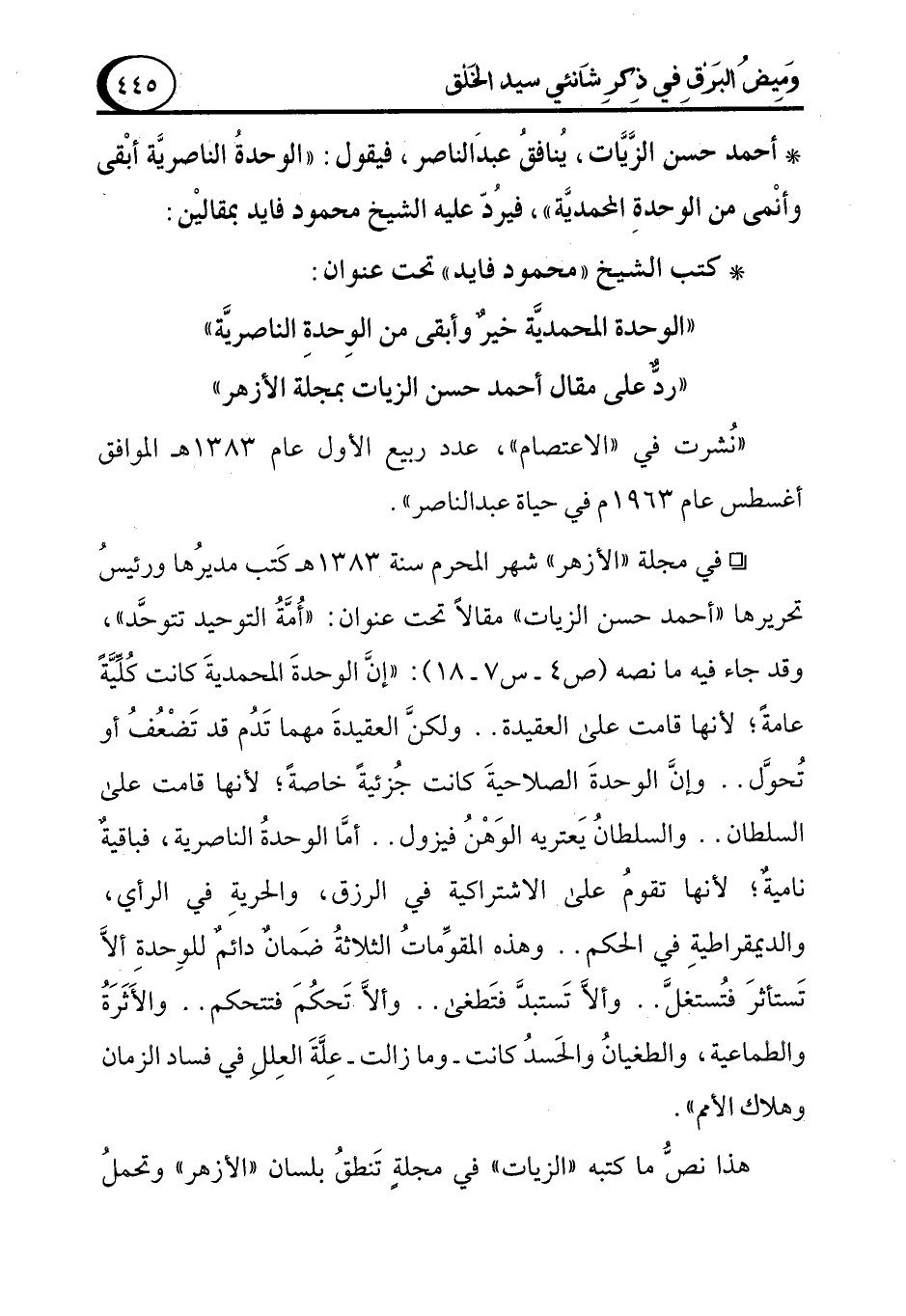 ° في مجلة "الأزهر" شهر المحرم سنة 1383 هـ كَتب مديرُها ورئيسُ تحريرها "أحمد حسن الزيات" مقالاً تحت عنوان: "أُمَّةُ التوحيد تتوحَّد"، وقد جاء فيه ما نصه (ص 4 - س 7 - 18): "إنَّ الوحدةَ المحمديةَ كانت كُلِّيَّةً عامةً؛ لأنها قامت على العقيدة .. ولكنَّ العقيدةَ مهما تَدُم قد تَضْعُفُ أو تُحوَّل .. وإنَّ الوحدةَ الصلاحيةَ كانت جُزئيةً خاصةً؛ لأنها قامت على السلطان .. والسلطانُ يَعتريه الوَهْنُ فيزول .. أمَّا الوحدةُ الناصرية، فباقيةٌ ناميةٌ؛ لأنها تقومُ على الاشتراكية في الرزق، والحريةِ في الرأي، والديمقراطيةِ في الحكم .. وهذه المقوِّماتُ الثلاثةُ ضَمانٌ دائمٌ للوِحدةِ ألاَّ تَستأثرَ فتُستغلَّ .. وألاَّ تَستبدَّ فتَطغى .. وألاَّ تَحكُمَ فتتحكم. والأَثَرَةُ والطماعية، والطغيانُ والحَسدُ كانت -وما زالت- عِلَّةَ العِللِ في فساد الزمان وهلاك الأمم".