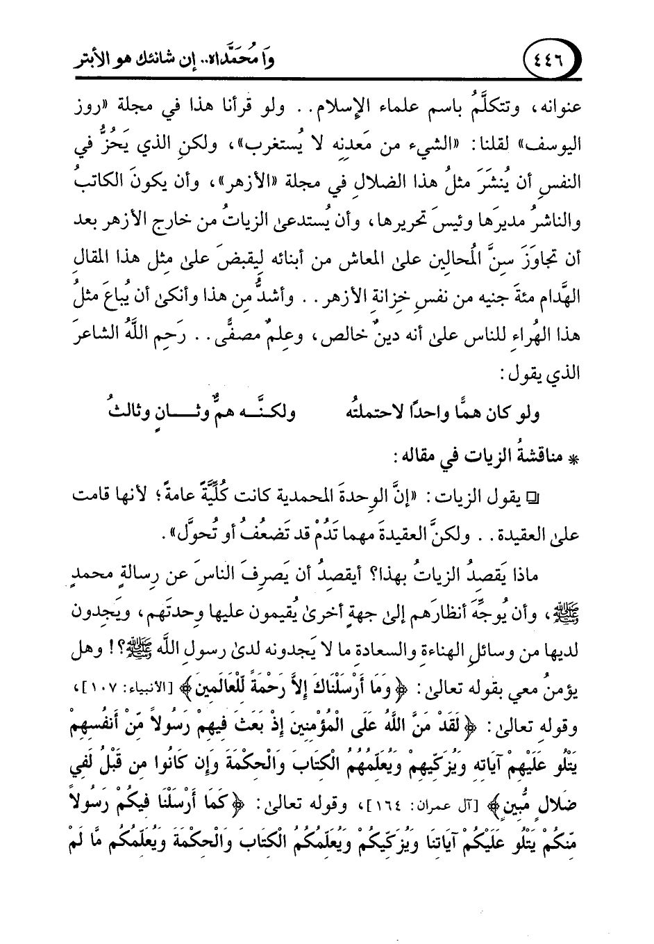 ماذا يَقصدُ الزياتُ بهذا؟ أيقصِدُ أن يَصرِفَ الناسَ عن رِسالةِ محمدٍ - صلى الله عليه وسلم -، وأن يُوجِّهَ أنظارَهم إلى جهةٍ أخرى يُقيمون عليها وِحدتَهم، ويَجِدون لديها من وسائلِ الهناءةِ والسعادةِ ما لا يَجدونه لدى رسولِ الله - صلى الله عليه وسلم -؟! وهل يؤمنُ معي بقوله تعالى: {وَمَا أَرْسَلْنَاكَ إلا رَحْمةً لِّلْعَالَمِينَ} [الأنبياء: 107]، وقولهِ تعالى: {لَقَدْ مَنَّ الله عَلَى الْمُؤْمِنِينَ إِذْ بَعَثَ فِيهِمْ رَسُولاً مِنْ أَنْفُسِهِمْ يَتْلُو عَلَيْهِمْ آيَاتِهِ وَيُزَكِّيهِمْ وَيُعَلِّمُهُمُ الْكِتَابَ وَالْحِكْمَةَ وَإِنْ كَانُوا مِنْ قَبْلُ لَفِي ضَلَالٍ مُبِينٍ} [آل عمران: 164]، وقوله تعالى: {كَمَا أَرْسَلْنَا فِيكُمْ رَسُولاً مِنْكُمْ يَتْلُو عَلَيْكُمْ آيَاتِنَا وَيُزَكِّيكُمْ وَيُعَلِّمُكُمُ الْكِتَابَ وَالْحِكْمَةَ وَيُعَلِّمُكُمْ مَا لَمْ