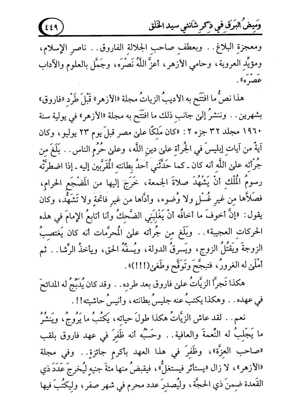 ومعجزةِ البلاغ .. وبعطفِ صاحبِ الجلالةِ الفاروق .. ناصرِ الإِسلام، ومؤيِّدِ العروبة، وحامي الأزهر، أعزَّ اللهُ نَصْرَه، وجَمَّل بالعلوم والآداب عَصْرَه".