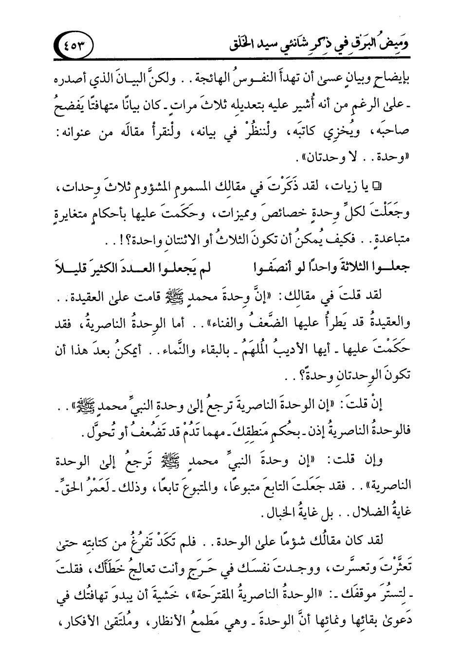 وإن قلت: "إن وحدةَ النبيِّ محمدٍ - صلى الله عليه وسلم - تَرجعُ إلى الوحدة الناصرية" .. فقد جَعَلتَ التابعَ متبوعًا، والمتبوعَ تابعًا، وذلك -لَعَمْرُ الحقِّ- غايةُ الضلال .. بل غايةُ الخبال.