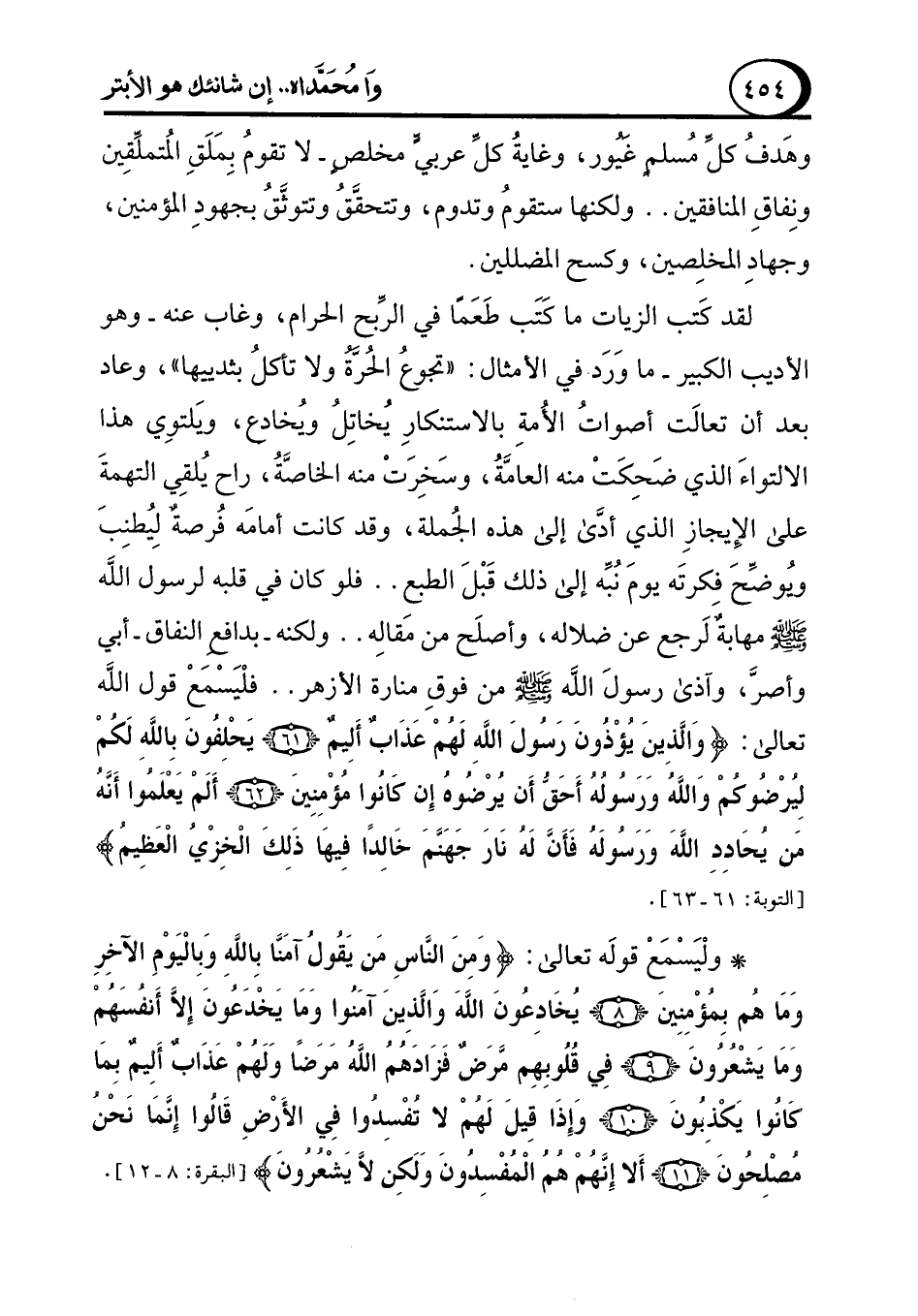 لقد كَتب الزيات ما كَتَب طَعَمًا في الرِّبح الحرام، وغاب عنه -وهو الأديب الكبير- ما وَرَد في الأمثال: "تجوعُ الحُرَّةُ ولا تأكلُ بثدييها"، وعاد بعد أن تعالَت أصواتُ الأُمةِ بالاستنكارِ يُخاتِلُ ويُخادع، ويَلتوِي هذا الالتواءَ الذي ضَحِكَتْ منه العامَّةُ، وسَخِرَتْ منه الخاصَّة، راح يُلقِي التهمةَ على الإِيجازِ الذي أدَّى إلى هذه الجُملة، وقد كانت أمامَه فُرصةٌ لِيُطنِبَ ويُوضِّحَ فكرتَه يومَ نُبِّه إلى ذلك قَبْلَ الطبع .. فلو كان في قلبه لرسول الله - صلى الله عليه وسلم - مهابةٌ لَرجع عن ضلاله، وأصلَح من مَقالِه .. ولكنه -بدافع النفاق- أبي وأصرَّ، وآذى رسولَ الله - صلى الله عليه وسلم - من فوقِ منارة الأزهر .. فلْيَسْمَعْ قول الله تعالى: {وَالَّذِينَ يُؤْذُونَ رَسُولَ اللَّهِ لَهُمْ عَذَابٌ أَلِيمٌ (61) يَحْلِفُونَ بِاللَّهِ لَكُمْ لِيُرْضُوكُمْ وَاللَّهُ وَرَسُولُهُ أَحَقُّ أَنْ يُرْضُوهُ إِنْ كَانُوا مُؤْمِنِينَ (62) أَلَمْ يَعْلَمُوا أَنَّهُ مَنْ يُحَادِدِ اللَّهَ وَرَسُولَهُ فَأَنَّ لَهُ نَارَ جَهَنَّمَ خَالِدًا فِيهَا ذَلِكَ الْخِزْيُ الْعَظِيمُ} [التوبة: 61 - 63].