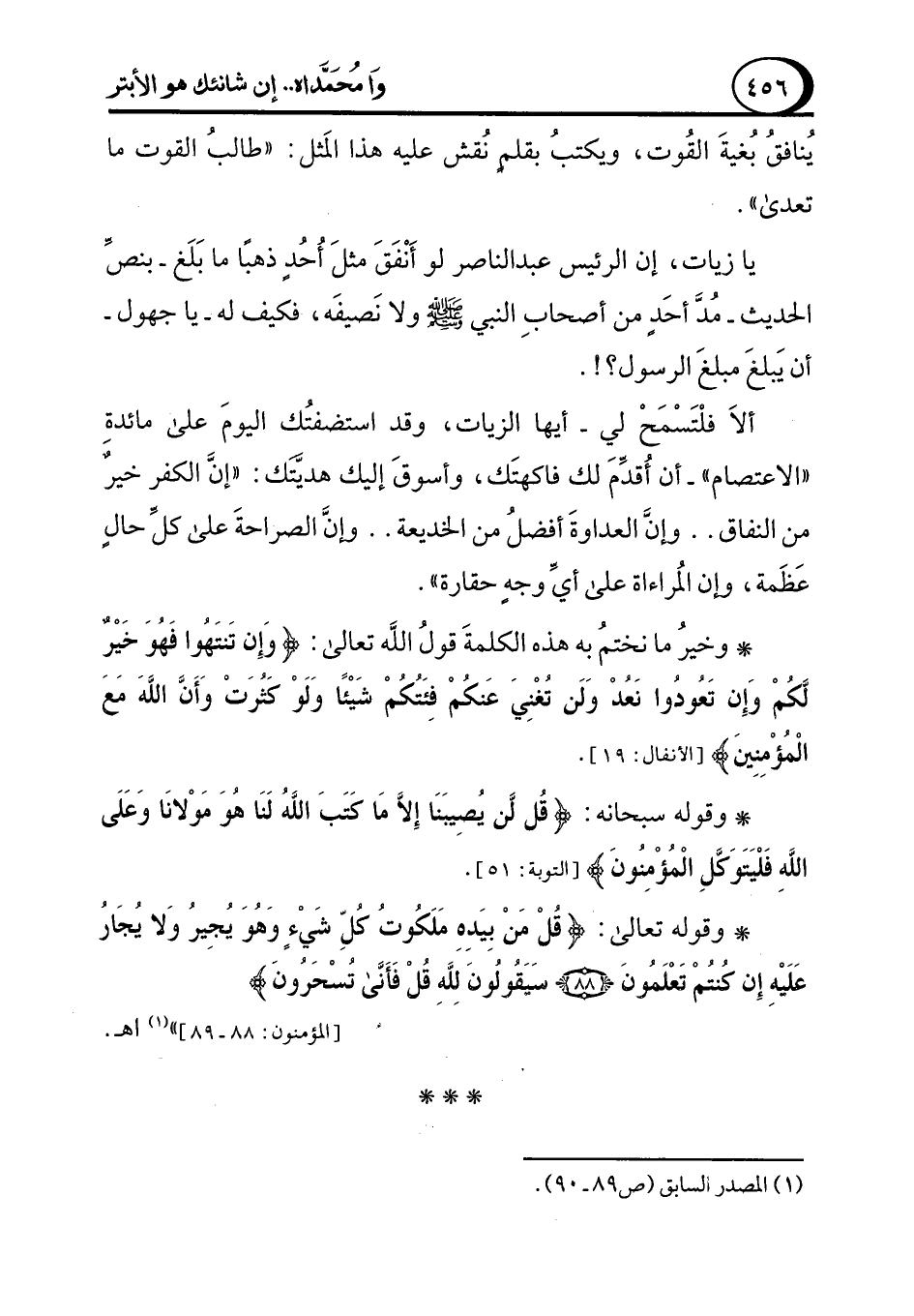 يا زيات، إن الرئيس عبد الناصر لو أَنْفَقَ مثلَ أُحُدٍ ذهبًا ما بَلَغ -بنصِّ الحديث- مُدَّ أحَدٍ من أصحابِ النبي - صلى الله عليه وسلم - ولا نَصيفَه، فكيف له -يا جهول- أن يَبلغَ مبلغَ الرسول؟!.