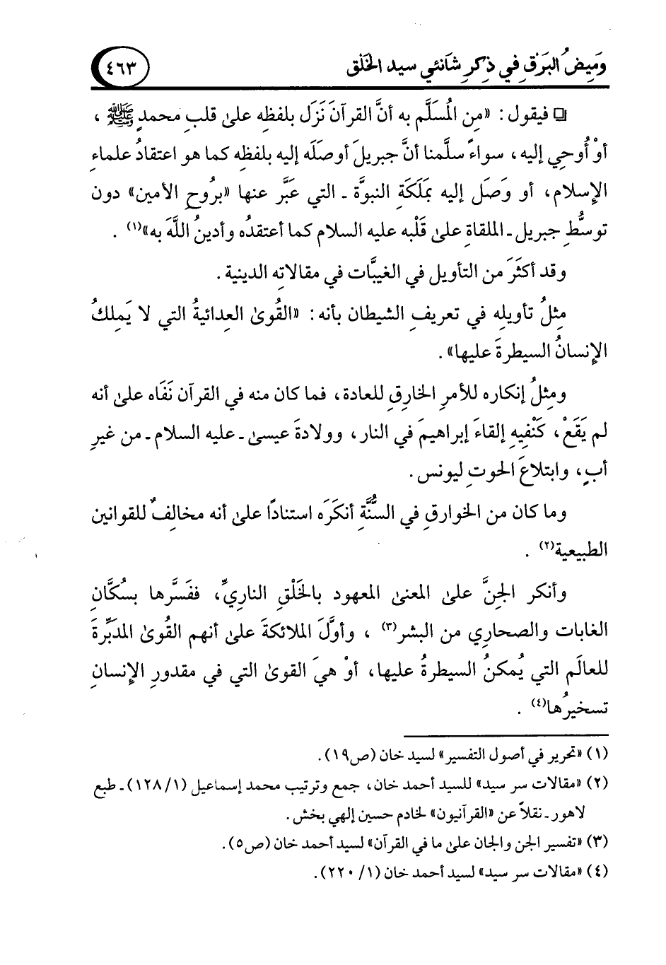 (¬2) "مقالات سر سيد" للسيد أحمد خان، جمع وترتيب محمد إسماعيل (1/ 128) -طبع لاهور - نقلاً عن "القرآنيون" لخادم حسين إلهي بخش.
