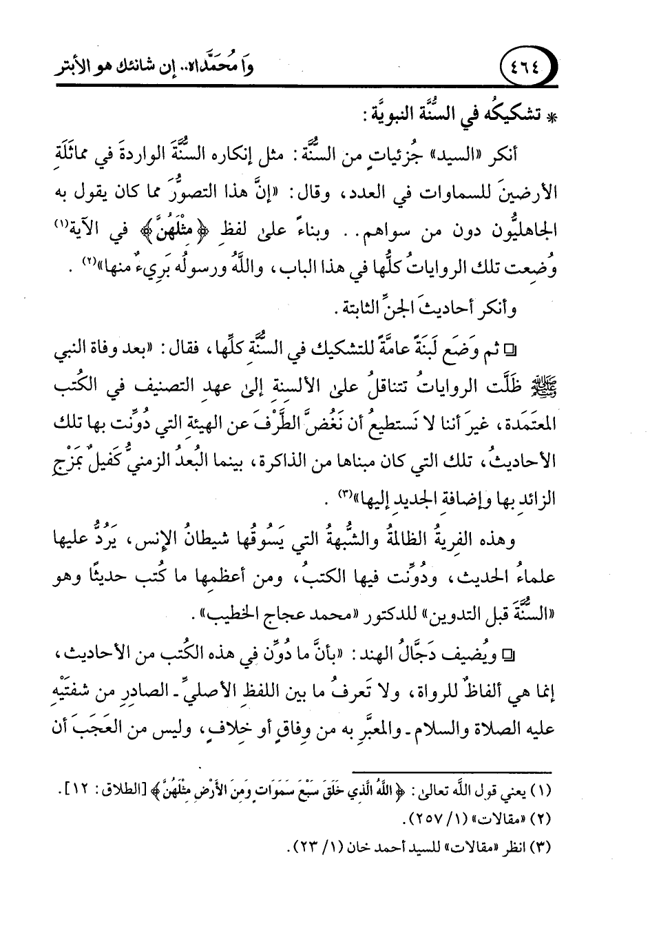 * تشكيكُه في السُّنَّة النبويَّة: