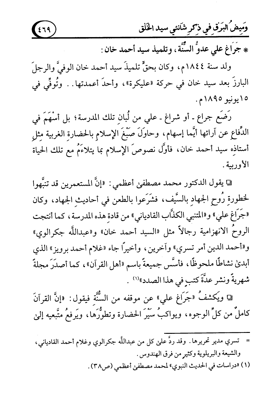 ° يقول الدكتور محمد مصطفى أعظمي: "إنَّ المستعمرين قد تنبَّهوا لخطورةِ رُوحِ الجهادِ بالسَّيف، فشَرَعوا بالطعن في أحاديثِ الجهاد، وكان "جَرَاغ علي" و"المتنبي الكذَّاب القادياني" من قادةِ هذه المدرسة، كما أنتجت الروحُ الانهزامية رجالاً مثل "السيد أحمد خان" و"عبد الله جكرالوي" و"أحمد الدين أمر تسري" وآخرين، وأخيرًا جاء "غلام أحمد برويز" الذي أبدى نشاطًا ملحوظًا، فأسسَّ جميعةً باسم "أهل القرآن"، كما أصدَرَ مجلةً شهريةً ونشر عدَّةَ كتبٍ في هذا الصدد" (¬1).