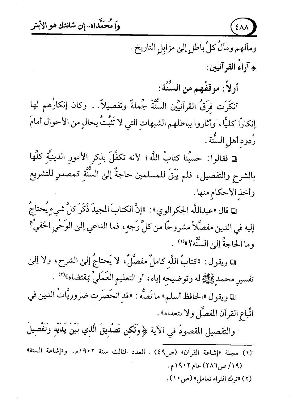 ° ويقول: "كتابُ اللهِ كاملٌ مفصَّلٌ، لا يَحتاجُ إلى الشرح، ولا إلى تفسيرِ محمدٍٍ - صلى الله عليه وسلم - له وتوضيحِه إياه، أو التعليمِ العَمَليِّ بمقتضاه" (¬2).
