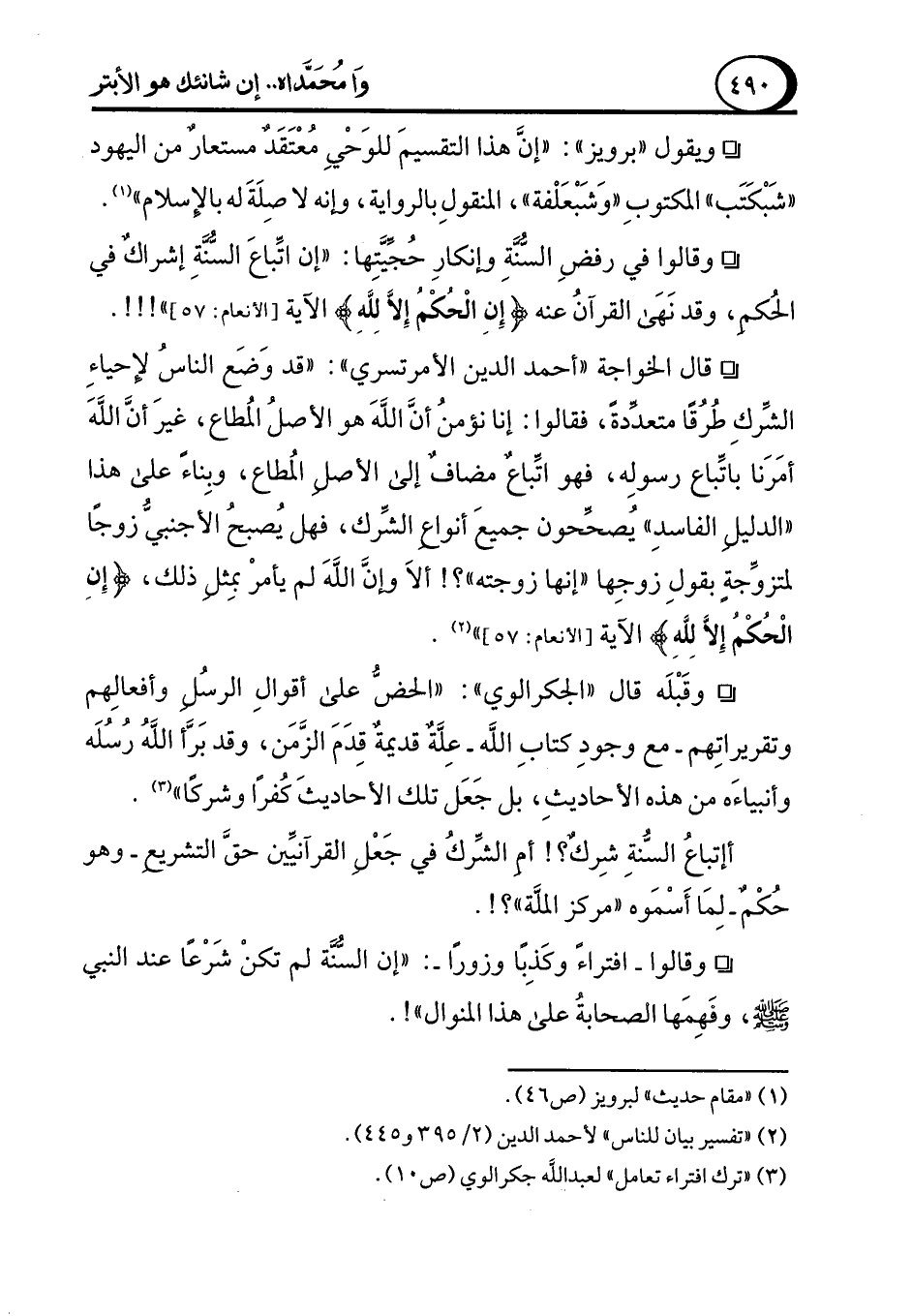 ° وقَبْلَه قال "الجكرالوي": "الحضُّ على أقوالِ الرسُل وأفعالِهم وتقريراتِهم -مع وجودِ كتابِ الله- عِلَّةٌ قديمةٌ قِدَمَ الزَّمَن، وقد بَرَّأ اللهُ رُسُلَه وأنبياءَه من هذه الأحاديثِ، بل جَعَل تلك الأحاديثَ كُفرًا وشركًا" (¬3).