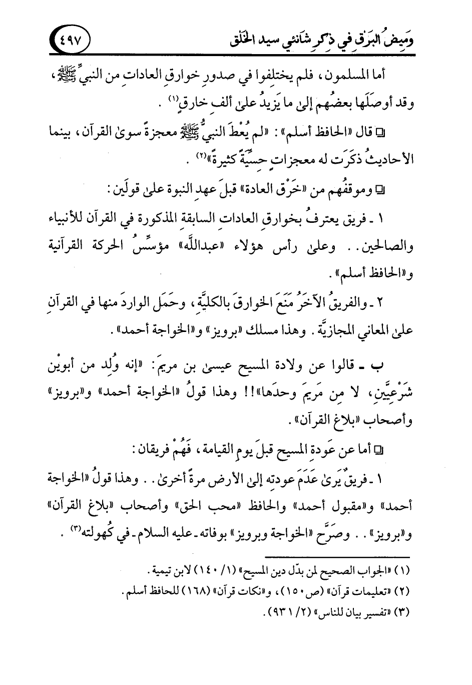 2 - والفريقُ الآخَر مَنَعَ الخوارقَ بالكليَّةِ، وحَمَل الواردَ منها في القرآنِ على المعاني المجازيَّة. وهذا مسلك "برويز" و"الخواجة أحمد".